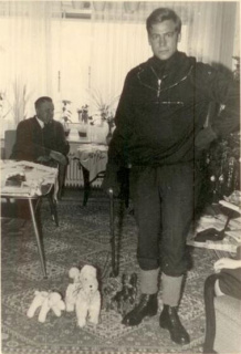 In der Mitte der Vater in dem Alter, in dem ich jetzt bin – und links unten in dem Alter, in dem ich auf dem Bild rechts unten zu sehen bin (dort links, mit Mutter und Bruder, nach der Wiedergutmachungskost und nach Entlassung aus dem Internierungslager 1948).