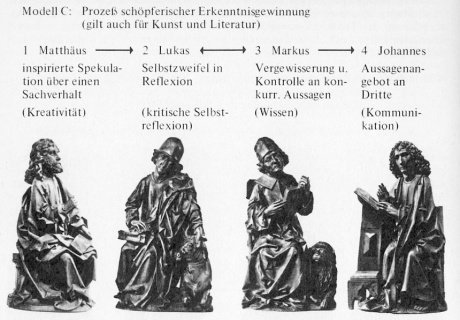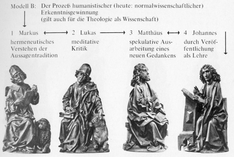 Der Prozeß der apostolisch-kanonischen Erkenntnisgewinnung verläuft über folgende Ordnung der Erkenntnisschritte, die zugleich einen möglichen Zusammenhang der Vierergruppe darstellt, obgleich diese Zuordnung mit der künstlerischen Gestaltlogik nicht in Übereinstimmung zu bringen ist. Die Erkenntnis umfaßt dieser Zuordnung gemäß immer zugleich Offenbarungswissen, Traditionswissen, Selbstwissen und Lehrwissen.