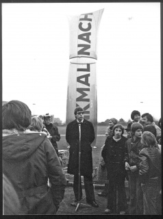 Rede auf einem von der Gesamthochschule Kassel veranstalteten Freiluft Action-Teaching im November 1975 mit dem Titel 'Denk-mal-nach'. Brock initiierte das Denk-mal-nach-Denkmal und die Aktion für die Projektgruppe 'Denkmalpflege ist Sozialpolitik', Leitung Lucius BURCKHARD. Das Objekt baute Gernot MINKE.