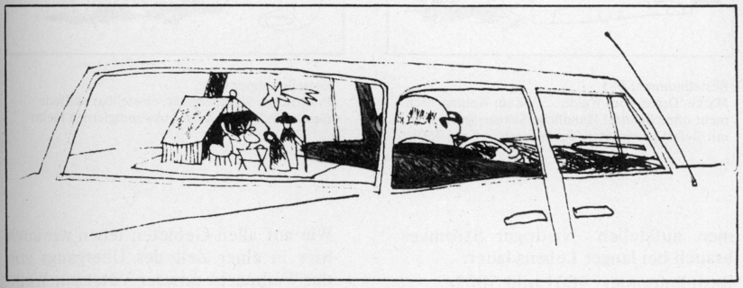 ist für moderne Menschcn eine besondere Schwierigkeit, die sehr zeitraubend sein kann. Wir ermöglichen Ihnen einen unmerklichen Übergang aus dem Alltag gerade zum weihnachtlichen Festtag durch unseren Tranquiliser "Friedensbringer' (ärztlich empfohlen). Sie werden in glücklicher Benommenheit, in seliger Stimmung das große Fest überstehen, ohne daß Ihnen auch nur die nächsten Angehörigen etwas ansehen können.