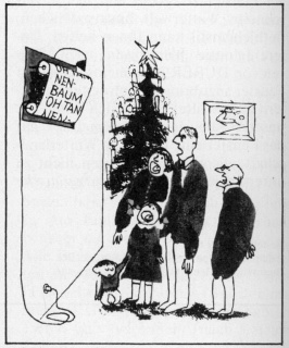 Es ist schwer zu verstehen, wenn wir im Zeitalter des Düsenverkehrs immer noch die einfache, naturgewachsene Tanne (T. ordinaria) benutzen. Den Fortschritt der Wissenschaft einbeziehend, hat die Bethlehemstil GmbH auf den Weihnachtsinseln durch friedliche Atombestrahlung Mutationen der ordinären Tanne hervorrufen lassen. Dadurch wurde erreicht, daß die Tannen von jetzt ab nadelfrei und gleich mit ihrem weihnachtlichen Schmuck und den Kerzen aufwachsen. Bei dieser für alle Stände notwendigen Anschaffung muß nur noch das Anzünden der Kerzen weiterhin von Menschenhand besorgt werden.
