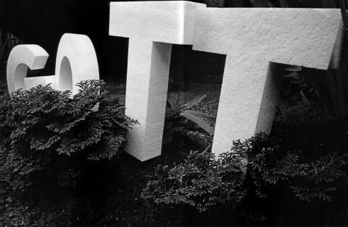 Zum Modellphoto: die beiden T's sind als Glockentürme gedacht, als Aussichtsplattform, und enthalten die Versorgungseinrichtungen. Im G sind die Gemeinderäume, ein Tagesheim, die Wohnung des Pfarrers und Arbeitsräume für Jugendliche usw. untergebracht. Der Oberbogen des G ist nach oben offen und nach unten durchsichtig. Im 0 befindet sich der eigentliche Kirchenraum: die rituellen Handlungen werden durch regulierbare Bewegung im 0 auf einer Kreisbahn ausgedrückt. Zeitweilige Abschlüsse der Beteiligten während der Kreisbewegung erhöhen die Konzentration und ermöglichen Alleinsein. Die Bewegung des gesamten Raumes läßt die rituellen Handlungen sehr stark als tatsächliche Aktionen erscheinen.