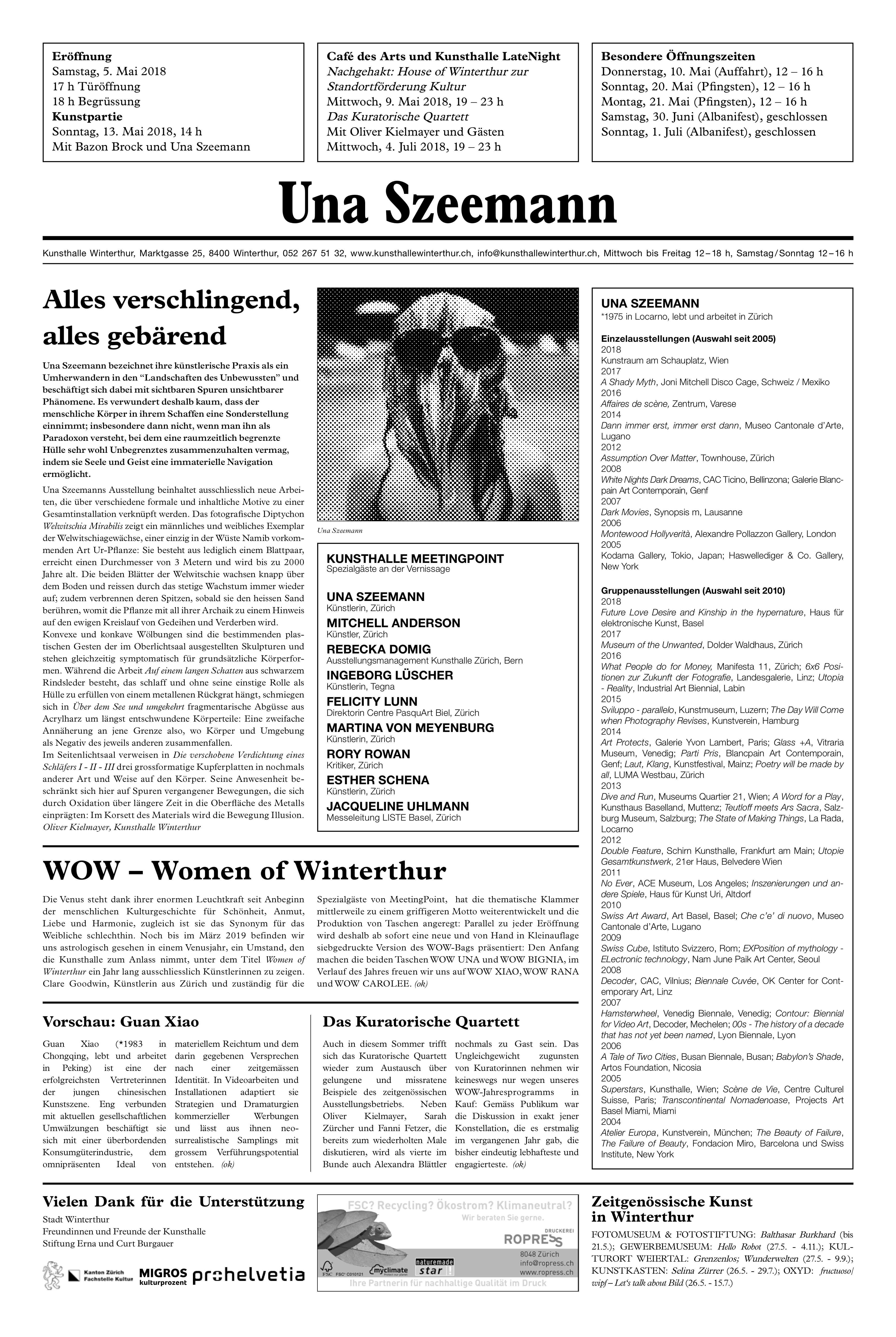 „Una Szeemann (*1975 in Locarno, lebt und arbeitet in Zürich) bezeichnet ihre künstlerische Praxis als ein Umherwandern in den "Landschaften des Unbewussten" und beschäftigt sich dabei mit sichtbaren Spuren unsichtbarer Phänomene. Ihre Ausstellung in der Kunsthalle Winterthur beinhaltet ausschliesslich neue Arbeiten, die über verschiedene formale und inhaltliche Motive zu einer Gesamtinstallation verknüpft werden. Das fotografische Diptychon Welwitschia Mirabilis zeigt ein männliches und weibliches Exemplar der Welwitschiagewächse, einer einzig in der Wüste Namib vorkommenden Art Ur-Pflanze: Sie besteht aus lediglich einem Blattpaar, erreicht einen Durchmesser von 3 Metern und wird bis zu 2000 Jahre alt.