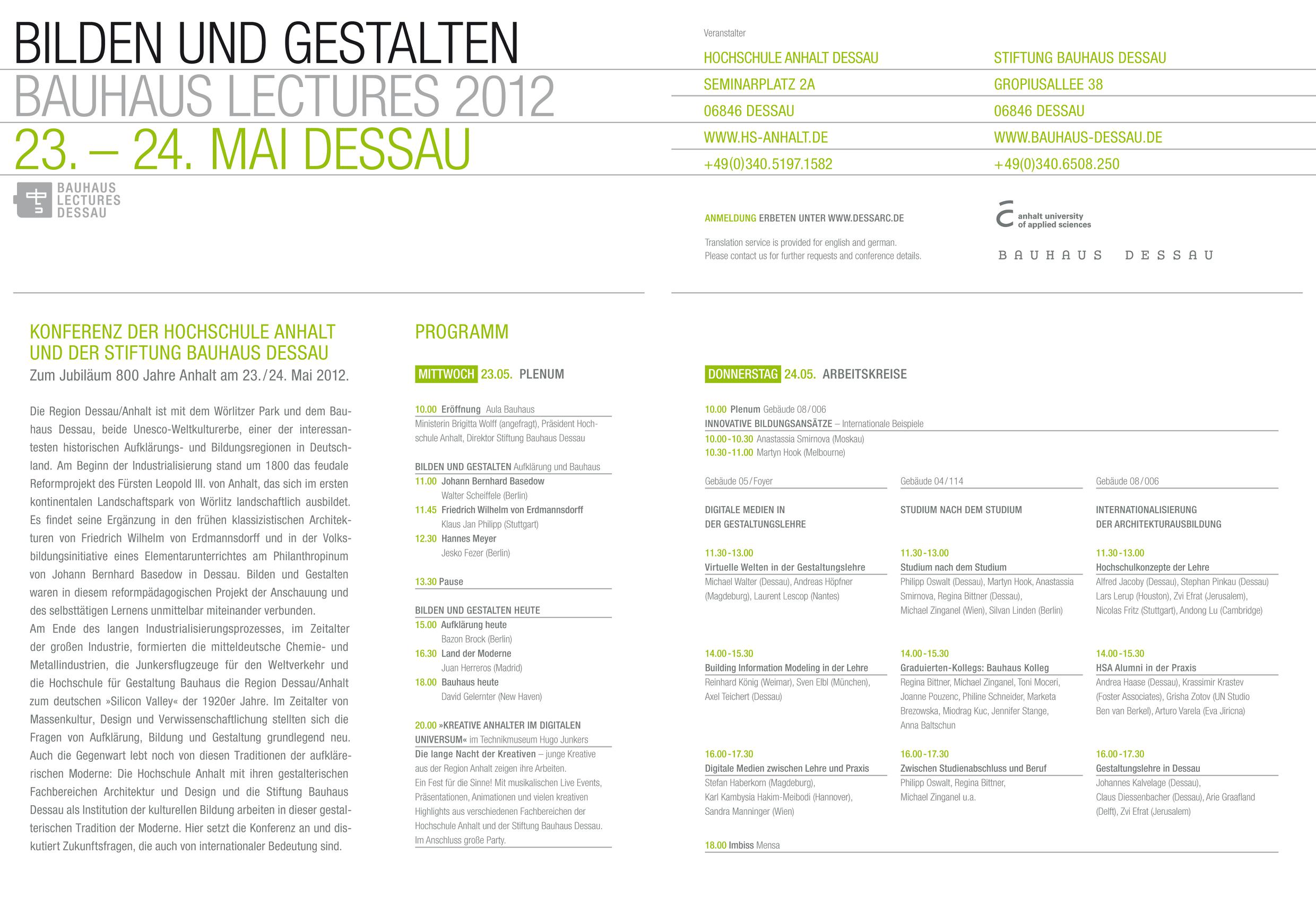Der erste Tag der Konferenz fragt danach, was Aufklärung (Bazon Brock, Wuppertal), Bauhaus (David Gelernter, New York) und Moderne (Juan Herreros, Madrid) heute heißt. Walter Scheiffele (Hochschule Weißensee, Berlin), Klaus Jan Philipp (Universität Stuttgart) und Jesko Fezer (Hochschule für Bildende Künste Hamburg) vergegenwärtigen die historischen Bildungstraditionen von Anhalt, die sich in den exemplarischen Gestaltungsansätzen von Basedow, Erdmannsdorff und dem Bauhausdirektor Hannes Meyer darstellen.