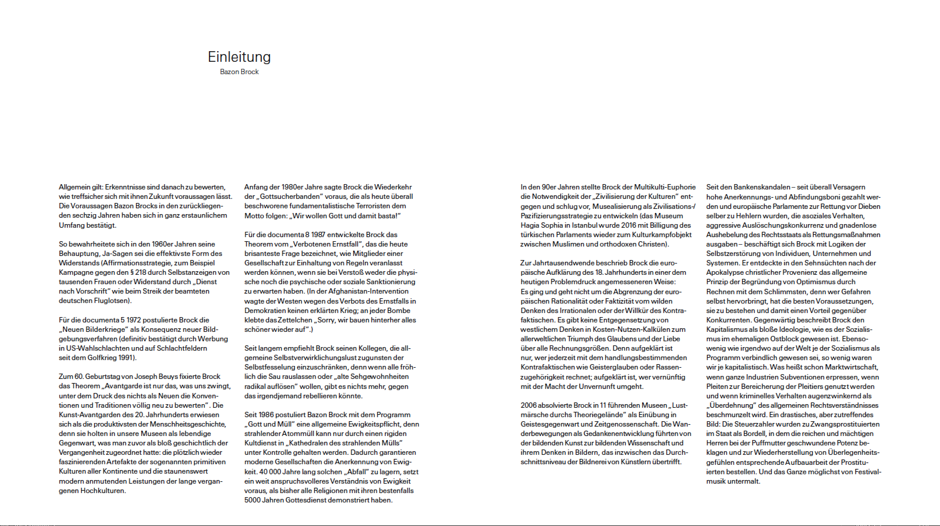 Allgemein gilt: Erkenntnisse sind danach zu bewerten, wie treffsicher sich mit ihnen Zukunft voraussagen lässt. Die Voraussagen Bazon Brocks in den zurückliegenden sechzig Jahren haben sich in ganz erstaunlichem Umfang bestätigt.