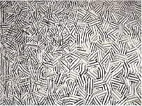 Mit dem Problem des Unterscheidens von etwas in hohem Maße Ununterscheidbarem hat auch Jasper Johns zu tun mit diesem seinem neuen, auf der documenta gezeigten Bild. Was ist das Ununterscheidbare daran? Ein Beispiel aus Ihrer Schulzeit; da drückte Ihnen der Lehrer einen Stempel in die Hand und sagte: „Nun stempel mal und mach mal mit dem Stempel ein Bild.“ Da haben Sie sich sicherlich gefragt, ja wie soll denn ein Bild entstehen, wenn ich nur immer dasselbe Ununterscheidbare wiederhole? Nun Johns zeigt, wie man das macht. Er verwendet einen Winkel als Grundelement, wie Sie Ihren Stempel, und führt nun eine Methode ein, die ihn dazu führt, beim Wiederholen des immer Gleichen zu etwas anderem, nämlich Unterscheidbarem zu kommen. Diese Methode ist die Spiegelung. Das ganze Bild baut sich aus Spiegelungen immer derselben Elemente auf. Also hier gibt es die Hauptspiegelungsachse, und Sie sehen da in der Mitte, daß das Ganze dreimal, viermal gespiegelt ist. Und die ganze Bildeinheit ist dann nochmal von der linken auf die rechte Seite gespiegelt. Das Wiederholen des immer Gleichen unter Verwendung einer bestimmten Methode – hier der Spiegelung – führt zu einem Bild, das in sich sehr wohl unterscheidbar ist.