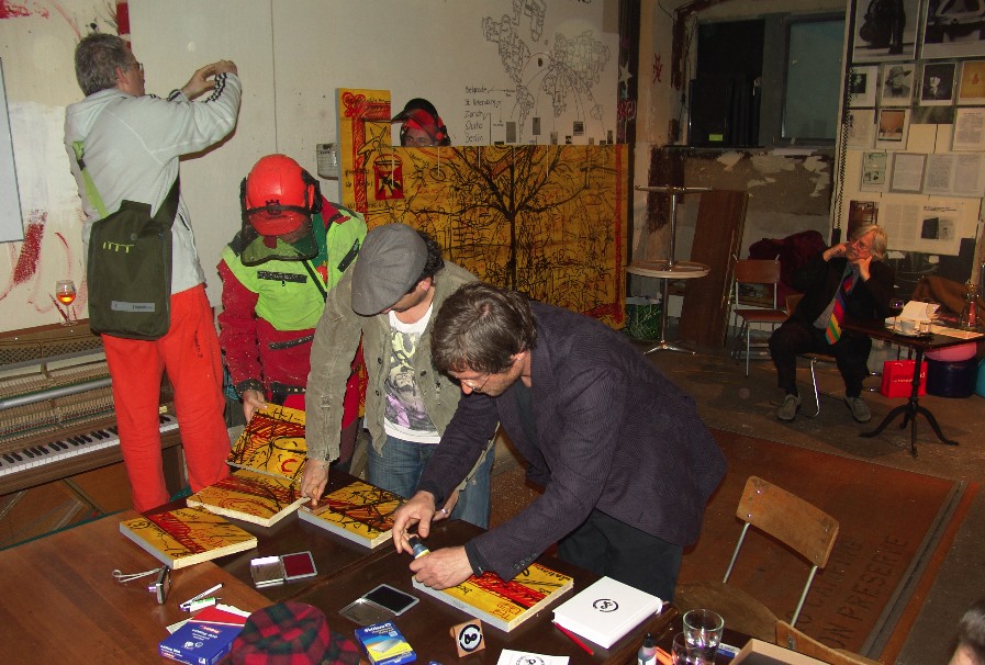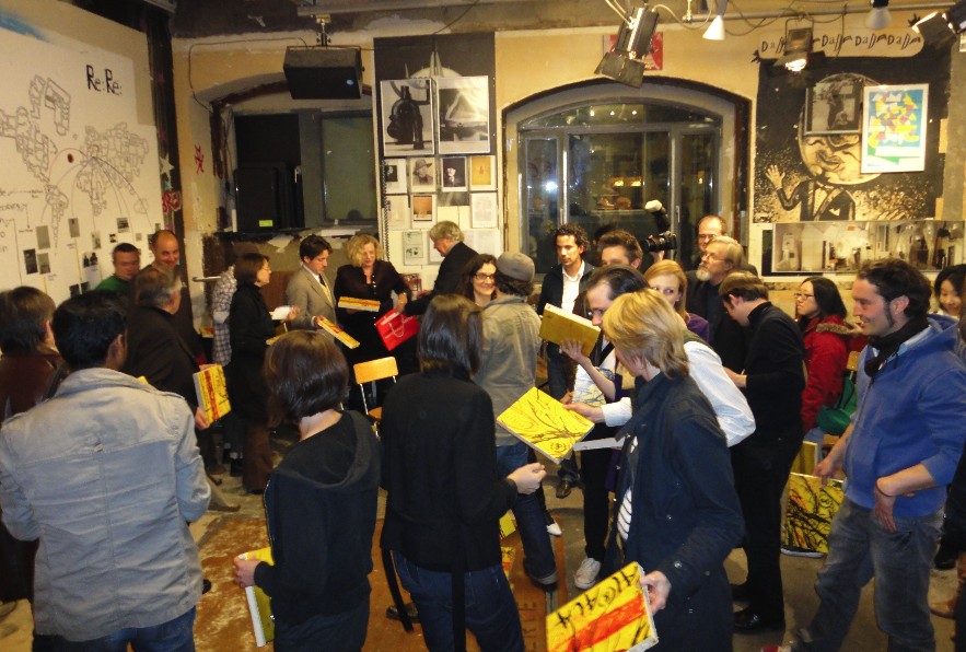 Das werden wir als Vollendung des Merz-Baus im Cabaret Voltaire demonstrieren. Com wird durch die Künstler Com&Com (Johannes M. Hedinger und Marcus Gossolt) dargestellt – den Brautführer Merz spielt Bazon Brock. Als Standesbeamter waltet Thomas Zacharias. Den neuen Bund „ComMerz“ segnet Kurt Schwitters selbst mit dem Ewigkeitssiegel TET. Die Trauzeugen und alle Hochzeitsgäste erhalten dieses Siegel zusammen mit einem Relikt des ersten Com-Baums als persönliche Grabbeigabe.