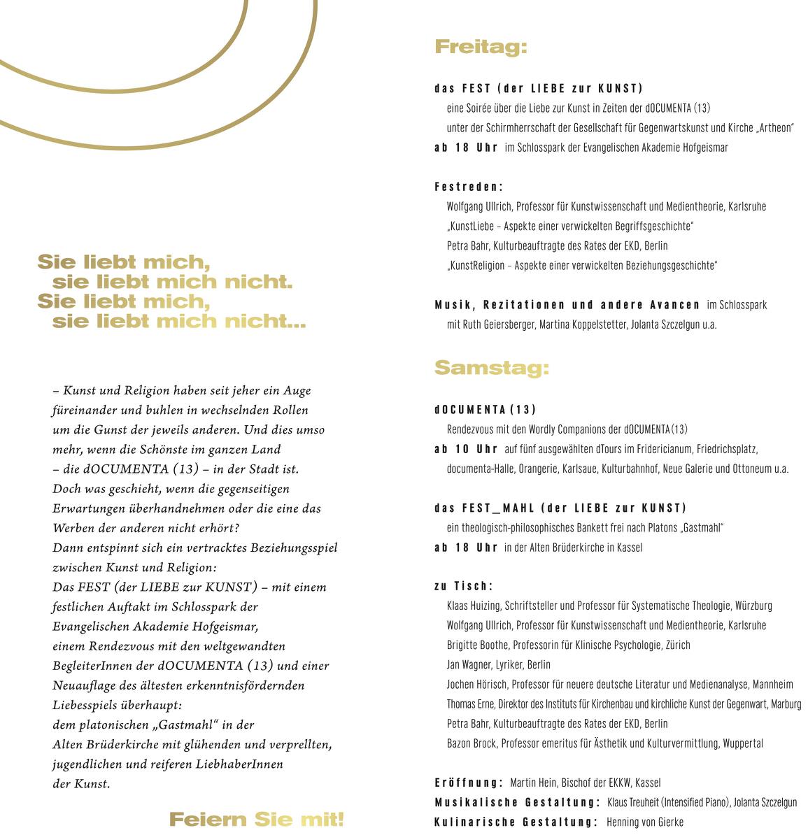 2012 ist das Jahr der dreizehnten dOCUMENTA in Kassel - und das zwanzigste Jahr der Gesellschaft für Gegenwartskunst und Kirche „Artheon". Beides sind Gründe zu feiern. Deshalb lädt „Artheon" gemeinsam mit der Evangelischen Kirche von Kurhessen-Waldeck, der Evangelischen Akademie Hofgeismar, der Evangelischen Kirche in Deutschland (EKD), dem Institut für Kirchenbau und kirchliche Kunst der Gegenwart und dem Kulturbüro der EKD vom 13. bis 15. Juli 2012 zu einem gemeinsamen Symposion: Dem „FEST (der LIEBE zur KUNST)" - mit einem festlichen Auftakt in der Evangelischen Akademie Hofgeismar, einem dOCUMENTA-Besuch und einem theologisch-philosophischen Bankett in der Alten Brüderkirche in Kassel - unter den Gästen: Petra Bahr, Brigitte Boothe, Bazon Brock, Thomas Erne, Jochen Hörisch, Klaas Huizing, Wolfgang Ullrich, Jan Wagner und viele andere. Feiern Sie mit!