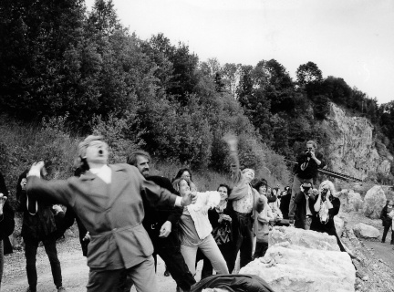 - Joseph Beuys traktiert mit der Schere ein gepünkteltes Papier; er blickt über seine linke Schulter auf ein Huhn, das kopflos aus dem Raum stelzt;