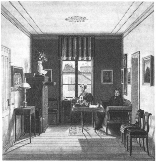 Dazu historische Beispiele: Kulturnationen, sagen wir zum Beispiel unser westlicher Kulturkreis, verstehen sich bekanntlich im Sinne der Befähigung von Individuen, sich als Mitglieder sozialer Kollektive zu bewähren, die bestimmten kulturellen Milieus und sonstigem Selbstverständnis verpflichtet sind. Dieses Selbstverständnis zeigt sich daran, dass die Mitglieder derart kultivierter Kollektive von vornherein nichts anderes zu lernen haben, als sich zu beherrschen. Individualpsychologisch von Freud als Sublimierungsfähigkeit usw. dargestellt, funktioniert dies aber in noch bedeutenderem Sinne als Befolgung niedergelegter, medial fixierter Regeln, nach deren Maßgaben diese sozialen Körper lebensfähig sind: etwa der Zehn Gebote, von denen immerhin neun die Bedeutung ihrer Befolgung als ein Unterlassen feiern. „Du sollst nicht stehlen, du sollst nicht ehebrechen, du sollst nicht begehren“ – das alles sind Handlungstypiken, die auf das Unterlassen aus sind. Und es muss dann erst zu einer kollektiven Würdigung von Handeln als Unterlassen oder als Nichthandeln kommen, um diese Handlungstypiken wirksam werden zu lassen. Und diese Würdigungen wiederum entstammen samt und sonders der medialen Kommunikationssphäre: Denken Sie nur an die Sorgfalt, die Shakespeare und alle nachfolgenden Dramatiker auf die Beschreibbarkeit dieses Typus verwendet haben, während es vergleichbare Würdigungen des Unterlassens in der Geschichtsschreibung eben gar nicht gibt. Auch die Malereigeschichte hat solche Würdigungen des Nichtstuns entwickelt, wie Ihnen dieses Biedermeiergemälde beweisen wird (Abb. 1: Wilhelm Brücke, DER PLÖTZLICHE BESUCH (Berlin 1842)).