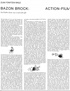 Was anderen Medien, ja auch anderen Gattungen des Films zur Forderung einer normativen Dramaturgie geworden ist: die Einheit von Raum und Zeit etwa, wird dem Action zur qualitativen, er bringt sie in den Übergang zum realen Leben zurück. Wer je im Action einige Leutchen an einem Tisch speisen sah, wird, über [den] bloßen Bildbegriff hinaus, sich und Freunde an einem Tisch anders essen sehen, nämlich im Verstande der realen Zeit, die vergeht, während … usw. Das Zurückziehen der Einheiten von der Leinwand ins Publikum, was die Zeitlichkeit anbetrifft, ist die reale Tat des Action-Films. Unveräußerlich. Der miserable Eindruck von Zeitlosigkeit, den Kunstprodukte im allgemeinen machen, wird versierten Action-Film-Besuchern nur noch beim Eierkochen entstehen, wo er auch hingehört. Das Zeitlose und Ewige wird so entdeckt als die Mode, die geschichtslose Geschichte, als Ladies Home Journal. Womit für die nächste Kolumne das Thema gestellt ist, aber das, wie das heutige, doch auch in Pulverform verabreicht werden wird. Über den Einfluß der kondensierten Form auf die Lebensgewohnheiten Heutiger jedoch gibt es Gott sei Dank schon eine Dissertation. Ich kann beruhigt fortfahren.