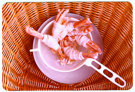 Gänsefüße werden gebrüht und abgezogen. Krallen werden abgeschnitten. Die weißen guten Därme von Gänsen werden ausgeschabt, gewaschen, mit Salz und etwas Essig gerieben, wieder gewaschen und ausgeschabt, wieder gewaschen usw. bis sie ganz sauber sind.