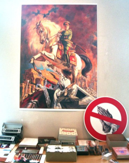 Ins graue und gräuliche Umfeld der Identitätstotems der Deutschen gehört die Reproduktion eines kolossalen Gemäldes, das in der Moskauer Tretjakow-Galerie hängt. Auf diesem Historiengemälde von Wassilij Jakowlew wird dem militärischen Genius des Sieges der Sowjetunion über Deutschland, Marschall Schukow, gehuldigt. Die Ikonographie des Gemäldes ist eindeutig: vor dem Hintergrund des brennenden Berlin – ausdrücklich sind Gedächtniskirche und Brandenburger Tor hervorgehoben – führt Schukow auf einem Schimmel, der sich über deutschen Feld- und Parteizeichen und Fahnen, den Trophäen des Sieges, aufbäumt, eine Parade an.