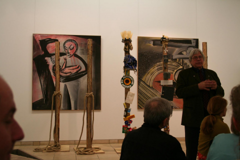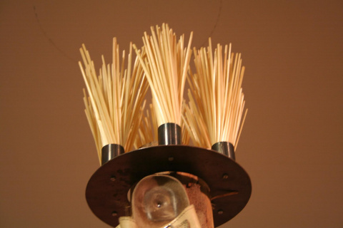 Die Spitze des zweiten Thementotems bildet die wilhelminische Pickelhaube, eine Art militärischer Version der Tarnkappe des Nibelungen, die einem Totenschädel aufgesetzt wurde. Es ist eine verhüllende Enthüllung besonderer Klasse, daß deutsche Krieger von den Zeiten der Freiheitskriege bis ins Dritte Reich ausgerechnet das Emblem des Totenschädels trugen. Soldaten führen immer nur ein Leben zum Tode, o Heidegger! Das ist der Grund, weshalb sie immer schon den Denkern voraus waren und selbst deutsche Philosophen den Ernstfall des Krieges nicht in ihr Nachdenken über die Welt aufnahmen. Der mit Pickelhaube bewehrte Soldat ist der Inbegriff der kulturellen Todes- und Tötungsbereitschaft. Das Lützow’sche Freikorps (1813) führte das Totenschädelemblem zum Zeichen unbedingten Opferwillens im Namen des deutschen Widerstands gegen und Befreiungskampfes von Napoleon ein. Später bediente sich die SS ebenfalls dieser Emblematik, ein weiteres Indiz, um die Deutschen in den Augen der anderen Nationen als mörderische Krieger und todessüchtige Kanonenhelden erscheinen zu lassen.