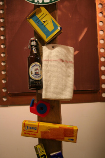 Der deutsche Narr mußte als armer Schlucker und Pilger stets anderen Menschen sich verständlich machen, nach dem Weg fragen, und hatte deshalb frühzeitig Langenscheidts Taschenwörterbuch, das erste seiner Art, dabei. Desweiteren transportierte er in seinem Rucksack eine wiederverschließbare Flasche, meist mit Bier gefüllt, das nach dem deutschen Reinheitsgebot von 1516 gebraut war. Das Prinzip gründlicher Reinheit und Rationalität berücksichtigte der ewige Wanderer ohnehin, mußte er doch auf kleinsten Raum seine gesamte Existenz organisieren. Solch eine Lebensform läßt die fixe Idee entstehen, auf der Flucht stets Autarkie bewahren zu wollen. Diesem Verlangen entsprechen bestimmte Produkterfindungen, die weltweit Synonyme für das Deutschsein geworden sind: Uhu-Alleskleber, Tesa-Film, Tempo-Taschentuch, Nivea, Odol und Leibniz-Keks in entsprechend gestalteter Verpackung.