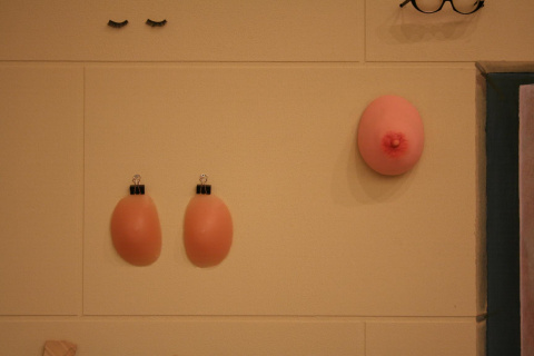 Im Theoriegelände zeigen wir die auf die Leistungen des großen preußischen Baumeisters Karl Friedrich Schinkel zurückverweisende Fake-Wand, der verschiedene Objekte appliziert sind, die den Betrachter mehr oder weniger peinlich an heutige Anpreisungen von Schönheitschirurgie am weiblichen wie männlichen Körper und an plastische Chirurgie zur Wiederherstellung von Körpern nach Deformationen durch Krankheiten und Unfälle denken lassen.