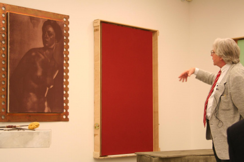 Zu Kasper Königs Programmschau „Westkunst“ 1981 trug Gerhard Merz ein Triptychon bei, dessen drei Einheiten wieder aus je zwei Tafeln bestanden, einem Siebdruck und einem monochromen Pigmentfeld. Besondere Aufmerksamkeit scheint Merz den Rahmungen der Tafeln gewidmet zu haben, von denen je zwei sich auf die Re-Interpretation der Staatsikonographie des Deutschen, des zaristischen und des Habsburger-Reiches beziehen. Das im Lehrpfad präsentierte Diptychon zeigt einerseits eine monochrome ochsenblutfarbige Pigmentbahn. Das Rot als pars pro toto verweist auf die Abwesenheit der beiden anderen Farben und steht für Blut, Parsifalgesetze, Reinheit und Rasse, und auch für heroisches Wissen, also das Wissen, „warum Blut fließen muß“. (7)