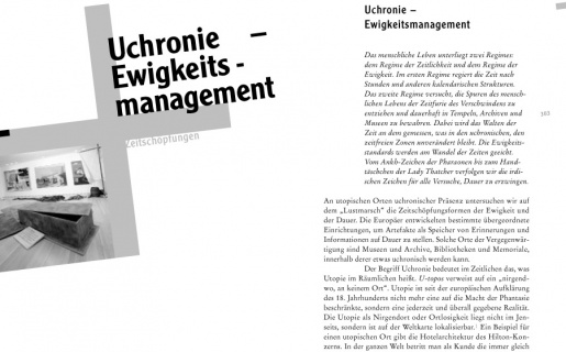 Wenn die Utopie das Nirgendwo im Überall verwirklicht, so realisiert die Uchronie die Nirgendzeit in jedem Augenblick: U-chronos ist (synonym zum Begriff der Ewigkeit) die aus der Zeit herausgenommene Gestalt, Form, Idee, die nicht durch den rasenden Wandel der Zeit berührbar sind. (2) Das mögen anthropologische Konstanten sein oder schlechthin Sachverhalte, die seit unvordenklichen Zeiten als gleichbleibend behauptet werden.