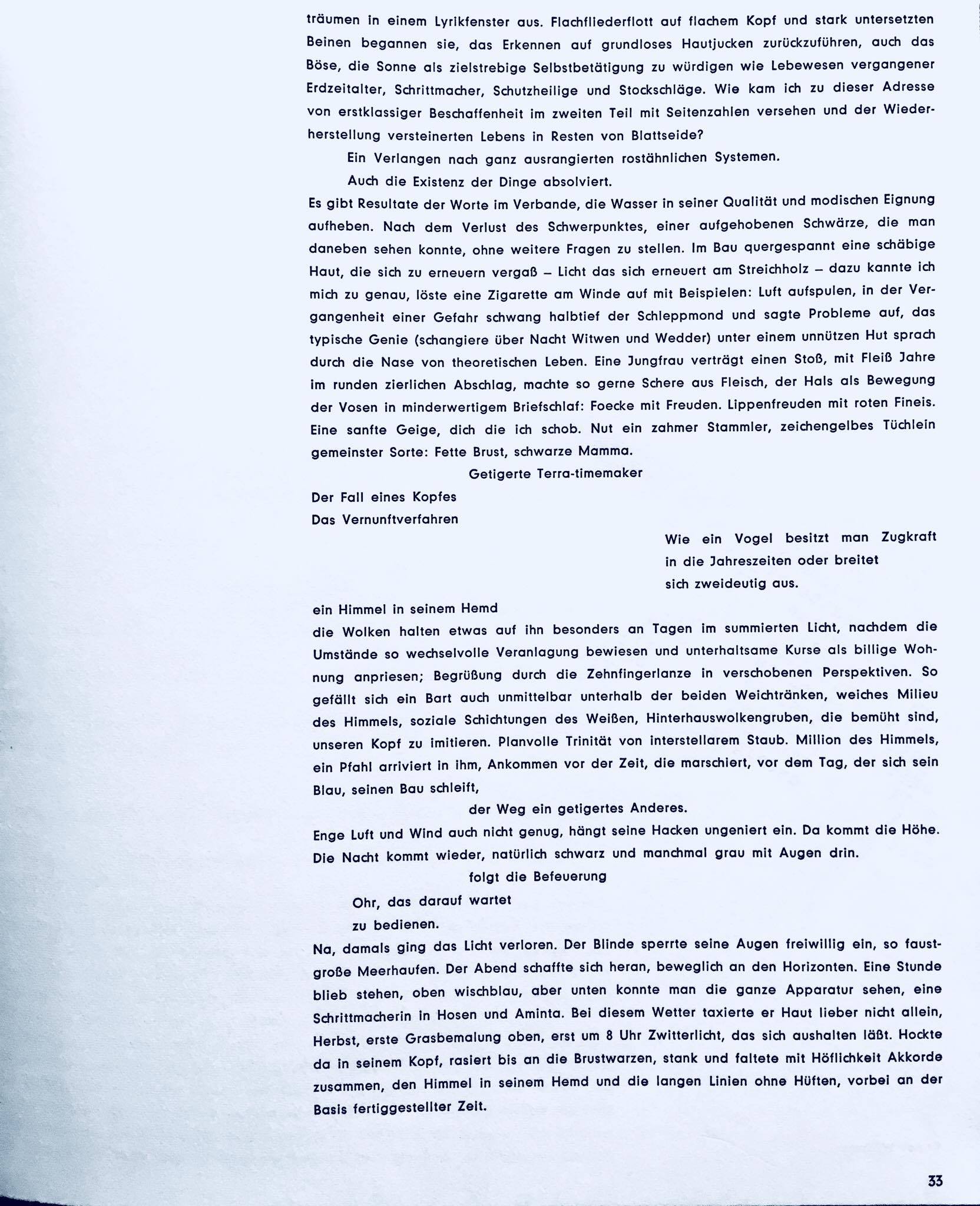 Zu den Folgen der Blumen, jenen fünf Stilen mit den tausend Blättern, stieg ich in die Linie 16 und verfiel der absoluten Situationslosigkeit. Auch der Verfall war kein Rückzug mehr. Linien und Küsten entluden ihre Richtungen sowie jegliche Tendenz zu einem Zustand. Sollte ich einen Stein in mein Bewußtsein saugen und das Reich der Eindeutigkeit ausbreiten auf dem ganzen Körper. Eidechsen wärmerer Länder und eine ganze Anzahl zusammengehöriger Gegenstände in halbfestem gallertartigem Zustand wie eingedickter Fruchtsaft verarbeitete sich als Schablonenmuster für Sommerdamenpelz.