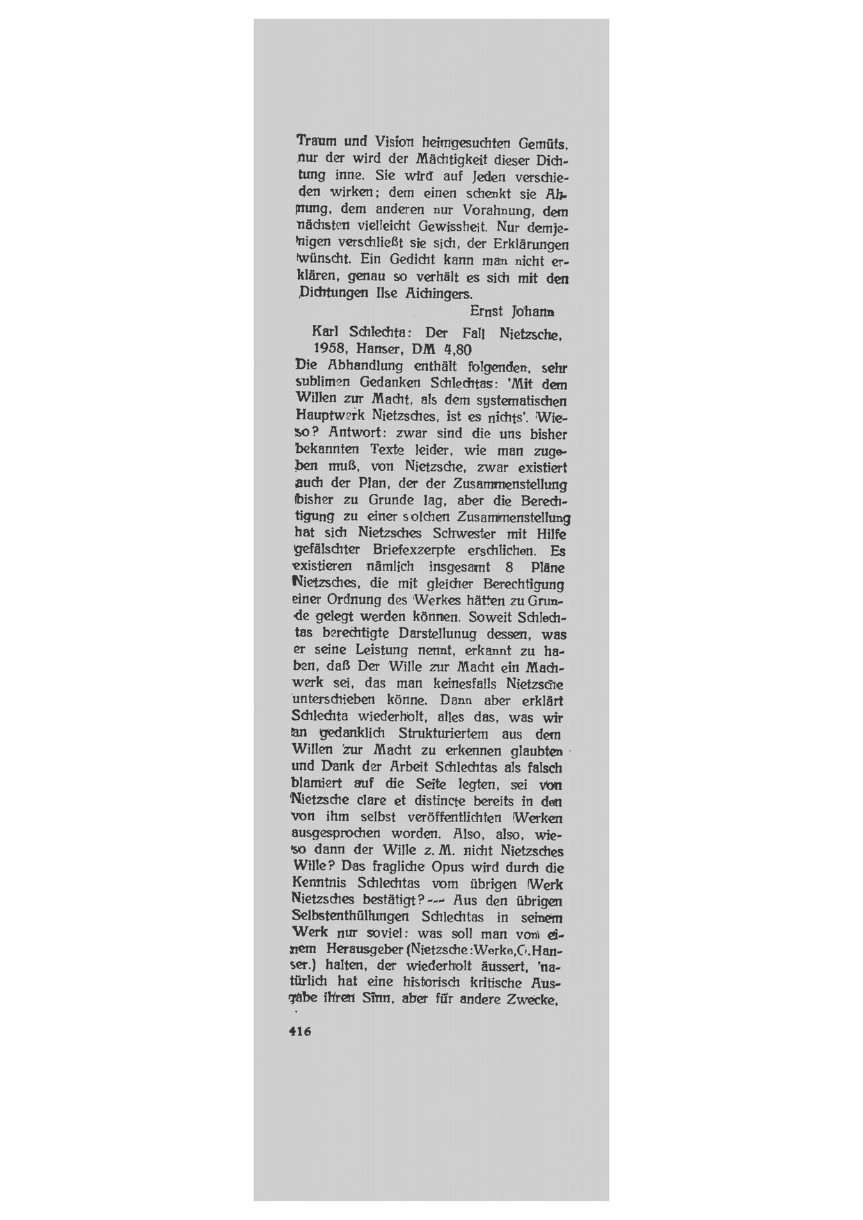 Die Abhandlung enthält folgenden, sehr sublimen Gedanken Schlechtas: "Mit dem Willen zur Macht, als dem systematischen Hauptwerk Nietzsches, ist es nichts". Wieso? Antwort: zwar sind die uns bisher bekannten Texte leoder, wie man zugeben muß, von Nietzsche, zwar existiert auch der Plan, der der Zusammenstellung bisher zu Grunde lag, aber die Berechtigung zu einer solchen Zusammenstellung hat sich Nietzsches Schwester mit Hilfe gefälschter Briefexzerpte erschlichen. Es existieren nämlich insgesamt 8 Pläne Nietzsches, die mit gleicher Berechtigung einer Ordnung des Werkes hätten zu Grunde gelegt werden können. Soweit Schlechtas berechtigte Darstellung dessen, was er seine Leistung nennt, erkannt zu haben, daß Der Wille Macht ein Machwerk sei, das keinesfalls Nietzsche unterschieben könne. Dann aber erklärt Schlechta wiederholt, alles das, was wir an gedanklich Strukturiertem aus dem Willen zur Macht zu erkennen glaubten und Dank der Arbeit Schlechtas als falsch blamiert auf die Seite legten, sei von Nietzsche claire et distincte bereits in den von ihm selbst veröffentlichten Werken ausgesprochen worden. Also, also, wieso dann der Wille z. M. nicht Nietzsches Wille? Das fragliche Opus wird durch die Kenntnis Schlechtas vom übrigen Werk Nietzsches bestätigt? --- Aus den übrigen Selbstenthüllungen Schlechtas in seinem Werk nur soviel: was soll man von einem Herausgeber (Nietzsche: Werke, O. Hanser) halten, der wiederholt äussert, "natürlich hat eine historisch kritische Ausgabe ihren Sinn, aber für andere Zwecke, die nicht die meinen sind" und "sicherlich wäre es interessant, den ganzen Nachlaß zuverlässig ediert zur Verfügung zu haben, aber interessant nur für die Spezialforschung, nicht für das allgemeine Bildungsbewußtsein." Für das allgemeine Bildungsbewußtsein schrieb auch Förster-Nietzsche und Zwecke hatte sie auch. Statt Nietzsche und kein Ende heißt es also immer noch: Nietzsche und kein Anfang!