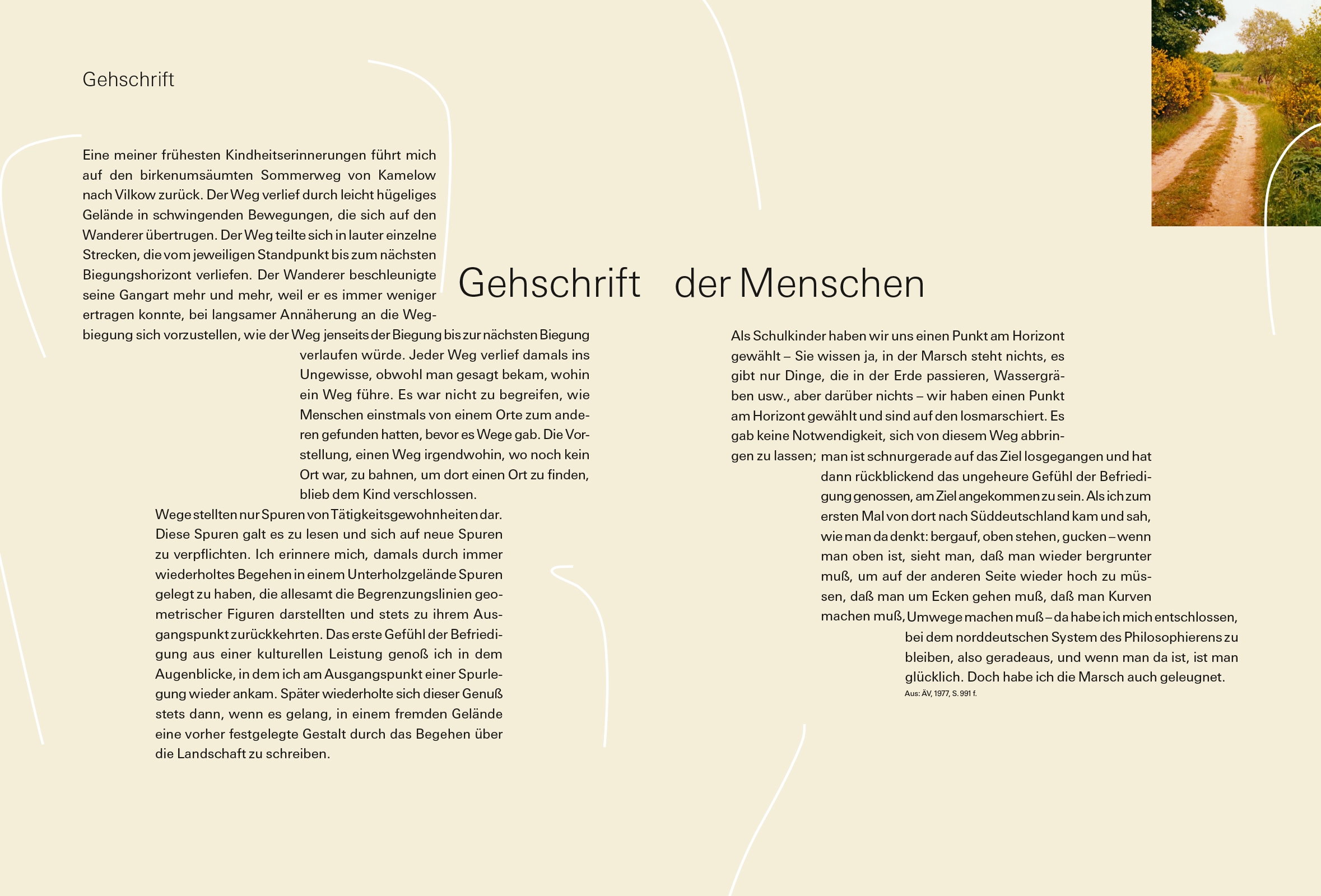 Wege stellten nur Spuren von Tätigkeitsgewohnheiten dar. Diese Spuren galt es zu lesen und sich auf neue Spuren zu verpflichten. Ich erinnere mich, damals durch immer wiederholtes Begehen in einem Unterholzgelände Spuren gelegt zu haben, die allesamt die Begrenzungslinien geometrischer Figuren darstellten und stets zu ihrem Ausgangspunkt zurückkehrten. Das erste Gefühl der Befriedigung aus einer kulturellen Leistung genoß ich in dem Augenblicke, in dem ich am Ausgangspunkt einer Spurlegung wieder ankam. Später wiederholte sich dieser Genuß stets dann, wenn es gelang, in einem fremden Gelände eine vorher festgelegte Gestalt durch das Begehen über die Landschaft zu schreiben.