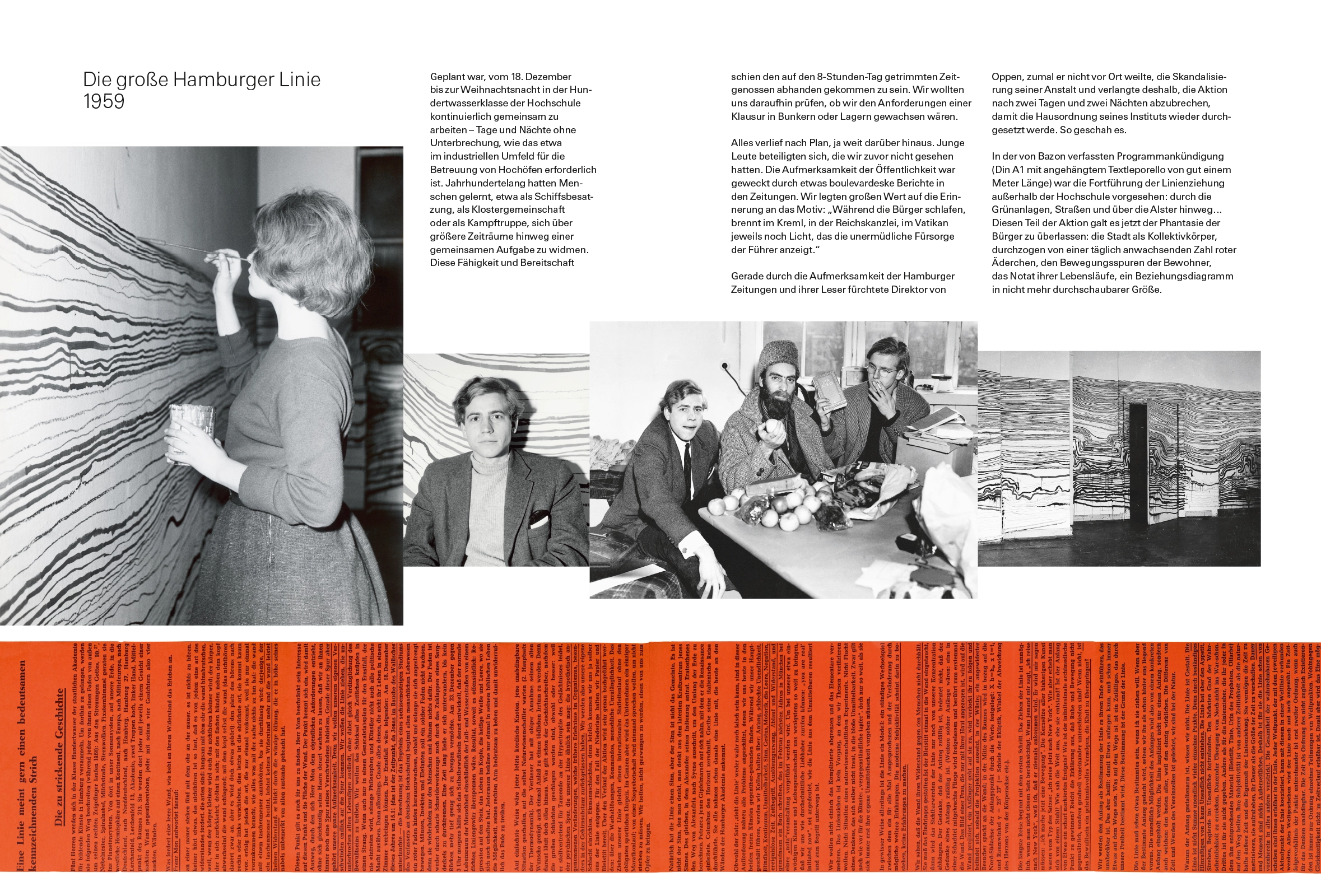 In der von Bazon verfassten Programmankündigung (Din A1 mit angehängtem Textleporello von gut einem Meter Länge) war die Fortführung der Linienziehung außerhalb der Hochschule vorgesehen: durch die Grünanlagen, Straßen und über die Alster hinweg … Diesen Teil der Aktion galt es jetzt der Phantasie der Bürger zu überlassen: die Stadt als Kollektivkörper, durchzogen von einer täglich anwachsenden Zahl roter Äderchen, den Bewegungsspuren der Bewohner, das Notat ihrer Lebensläufe, ein Beziehungsdiagramm in nicht mehr durchschaubarer Größe.