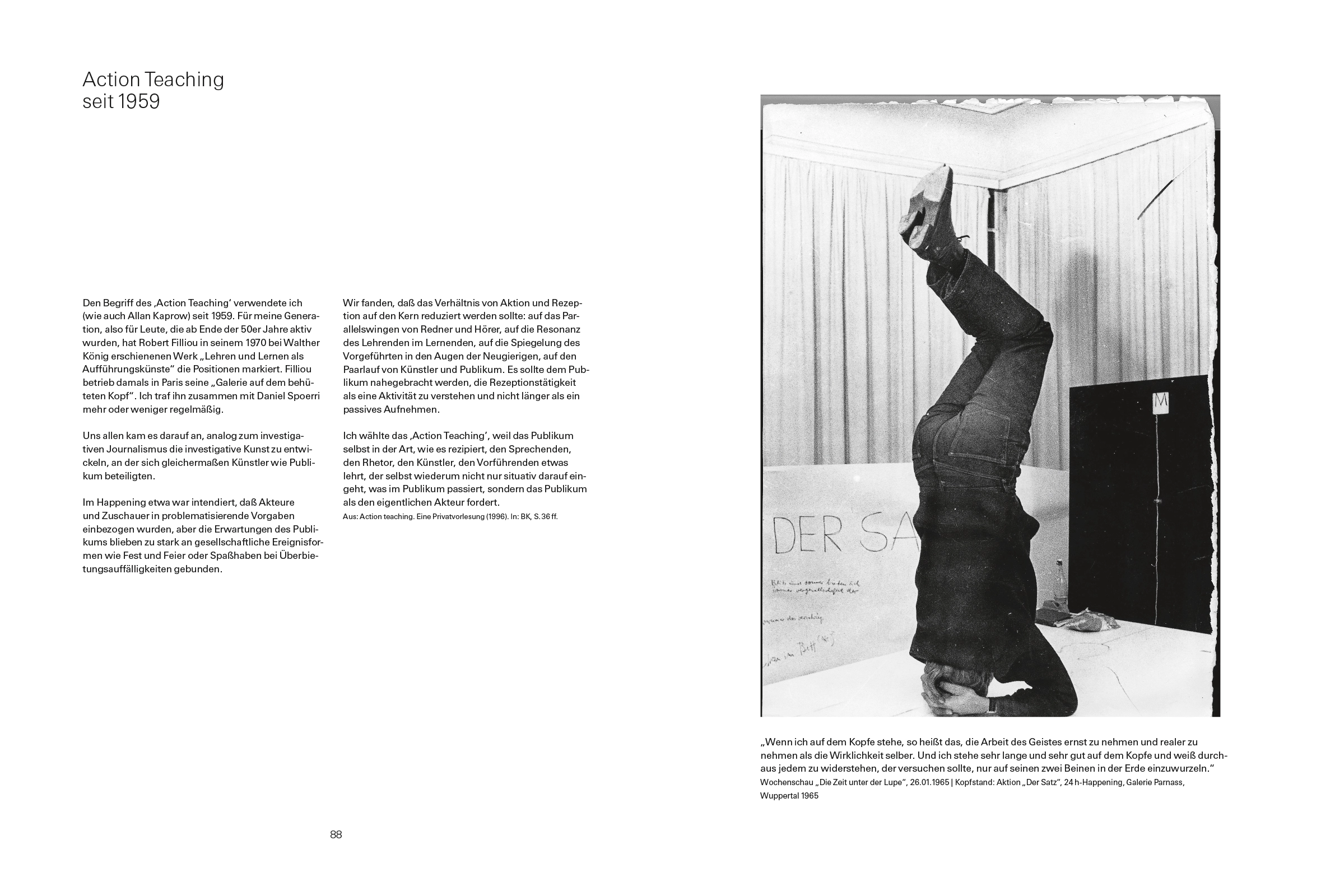 Den Begriff des ‚Action Teaching‘ verwendete ich (wie auch Allan Kaprow) seit 1959. Für meine Generation, also für Leute, die ab Ende der 50er Jahre aktiv wurden, hat Robert Filliou in seinem 1970 bei Walther König erschienenen Werk „Lehren und Lernen als Aufführungskünste“ die Positionen markiert. Filliou betrieb damals in Paris seine „Galerie auf dem behüteten Kopf“. Ich traf ihn zusammen mit Daniel Spoerri mehr oder weniger regelmäßig.