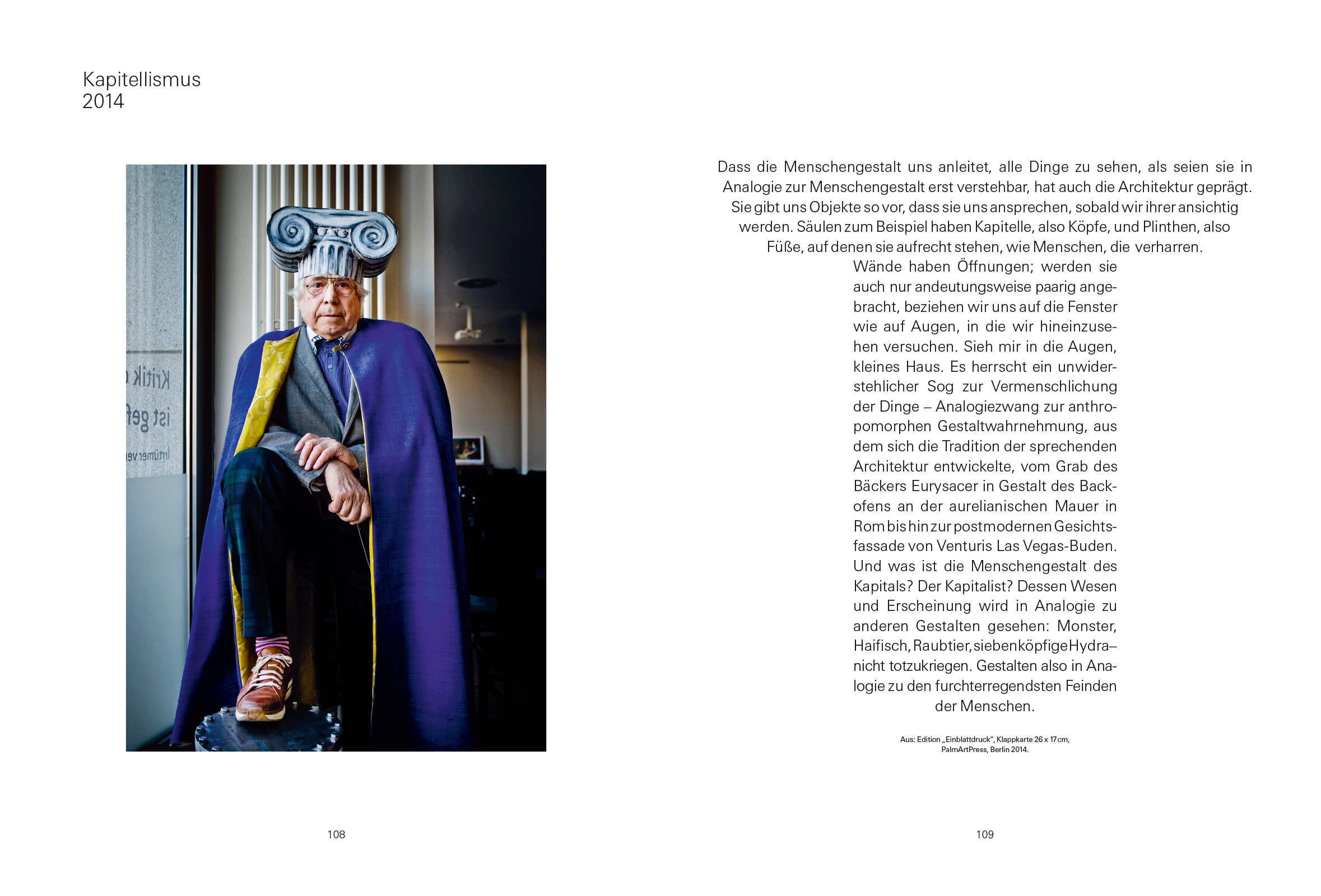 Dass die Menschengestalt uns anleitet, alle Dinge zu sehen, als seien sie in Analogie zur Menschengestalt erst verstehbar, hat auch die Architektur geprägt. Sie gibt uns Objekte so vor, dass sie uns ansprechen, sobald wir ihrer ansichtig werden. Säulen zum Beispiel haben Kapitelle, also Köpfe, und Plinthen, also Füße, auf denen sie aufrecht stehen, wie Menschen, die verharren. Wände haben Öffnungen; werden sie auch nur andeutungsweise paarig angebracht, beziehen wir uns auf die Fenster wie auf Augen, in die wir hineinzusehen versuchen. Sieh mir in die Augen, kleines Haus. Es herrscht ein unwiderstehlicher Sog zur Vermenschlichung der Dinge – Analogiezwang zur anthropomorphen Gestaltwahrnehmung, aus dem sich die Tradition der sprechenden Architektur entwickelte, vom Grab des Bäckers Eurysacer in Gestalt des Backofens an der aurelianischen Mauer in Rom bis hin zur postmodernen Gesichtsfassade von Venturis Las Vegas-Buden. Und was ist die Menschengestalt des Kapitals? Der Kapitalist? Dessen Wesen und Erscheinung wird in Analogie zu anderen Gestalten gesehen: Monster, Haifisch, Raubtier, siebenköpfige Hydra – nicht totzukriegen. Gestalten also in Analogie zu den furchterregendsten Feinden der Menschen.