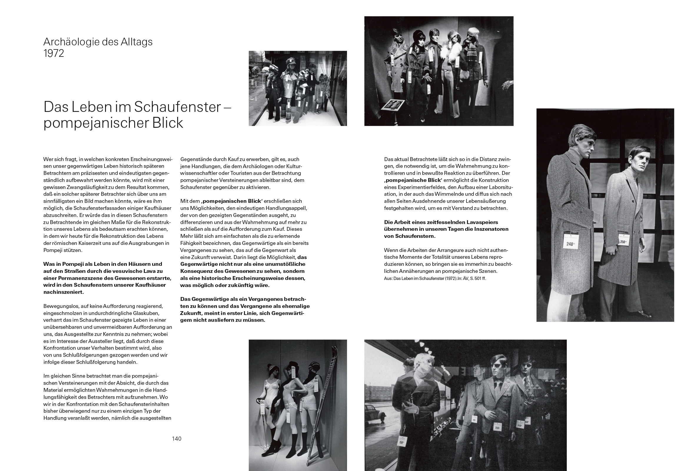 Wer sich fragt, in welchen konkreten Erscheinungsweisen unser gegenwärtiges Leben historisch späteren Betrachtern am präzisesten und eindeutigsten gegenständlich aufbewahrt werden könnte, wird mit einer gewissen Zwangsläufigkeit zu dem Resultat kommen, daß ein solcher späterer Betrachter sich über uns am sinnfälligsten ein Bild machen könnte, wäre es ihm möglich, die Schaufensterfassaden einiger Kaufhäuser abzuschreiten. Er würde das in diesen Schaufenstern zu Betrachtende im gleichen Maße für die Rekonstruktion unseres Lebens als bedeutsam erachten können, in dem wir heute für die Rekonstruktion des Lebens der römischen Kaiserzeit uns auf die Ausgrabungen in Pompeji stützen.