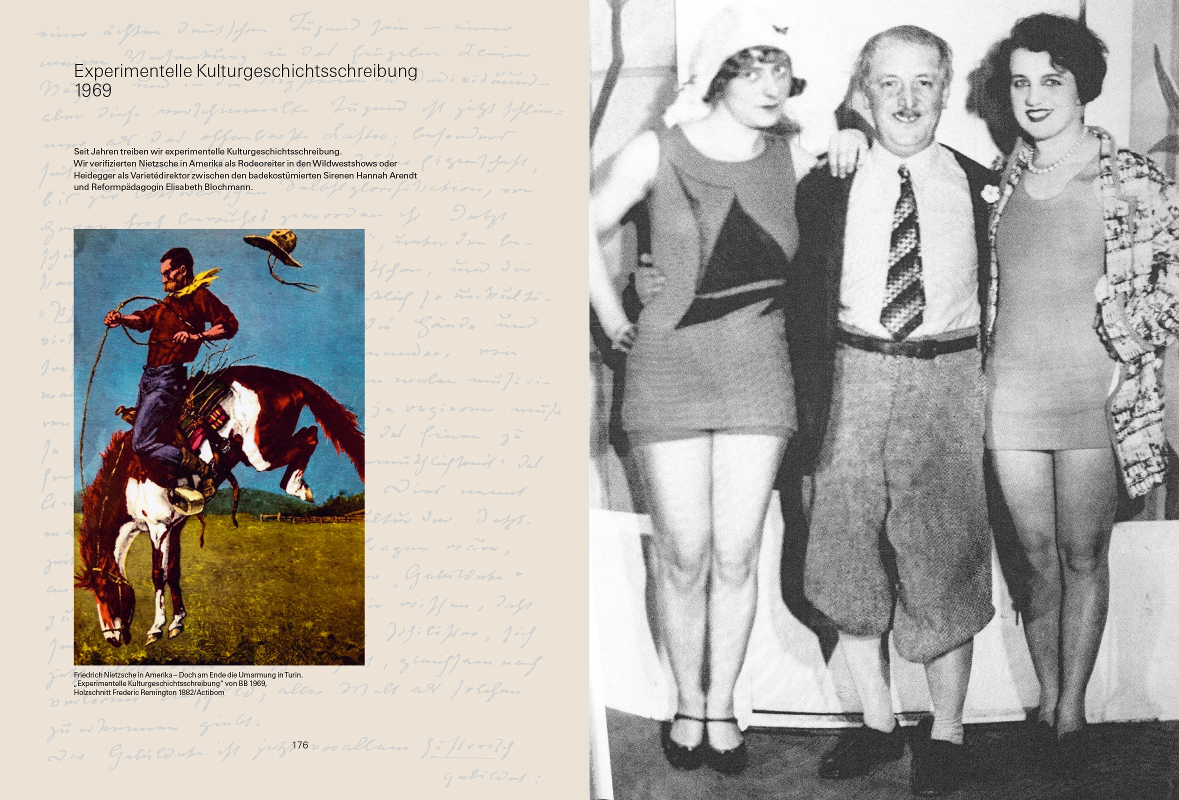 Seit Jahren treiben wir experimentelle Kulturgeschichtsschreibung. Wir verifizierten Nietzsche in Amerika als Rodeoreiter in den Wildwestshows oder Heidegger als Varieté direktor zwischen den badekostümierten Sirenen Hannah Arendt und Reformpädagogin Elisabeth Blochmann.