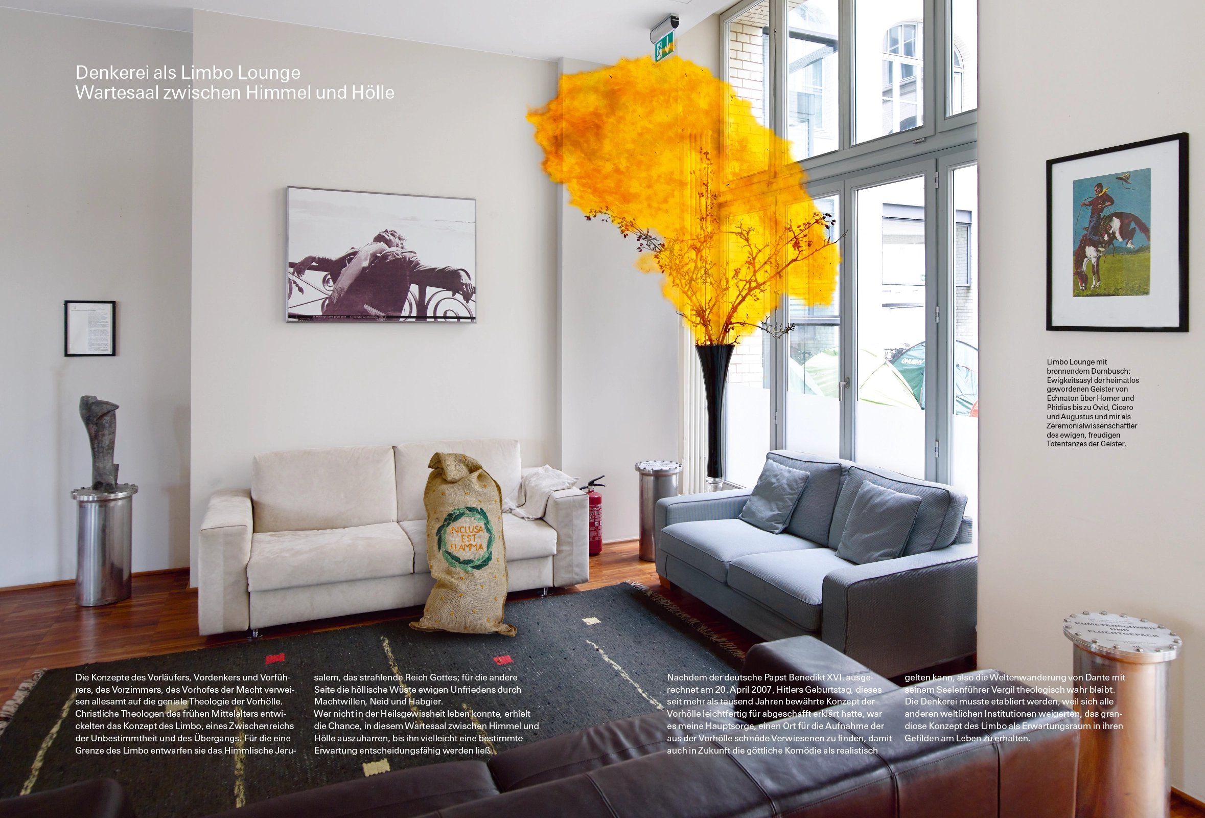 Nachdem der deutsche Papst Benedikt XVI. ausgerechnet am 20. April 2007, Hitlers Geburtstag, dieses seit mehr als tausend Jahren bewährte Konzept der Vorhölle leichtfertig für abgeschafft erklärt hatte, war es meine Hauptsorge, einen Ort für die Aufnahme der aus der Vorhölle schnöde Verwiesenen zu finden, damit auch in Zukunft die göttliche Komödie als realistisch gelten kann, also die Weltenwanderung von Dante mit seinem Seelenführer Vergil theologisch wahr bleibt. Die Denkerei musste etabliert werden, weil sich alle anderen weltlichen Institutionen weigerten, das grandiose Konzept des Limbo als Erwartungsraum in ihren Gefilden am Leben zu erhalten.