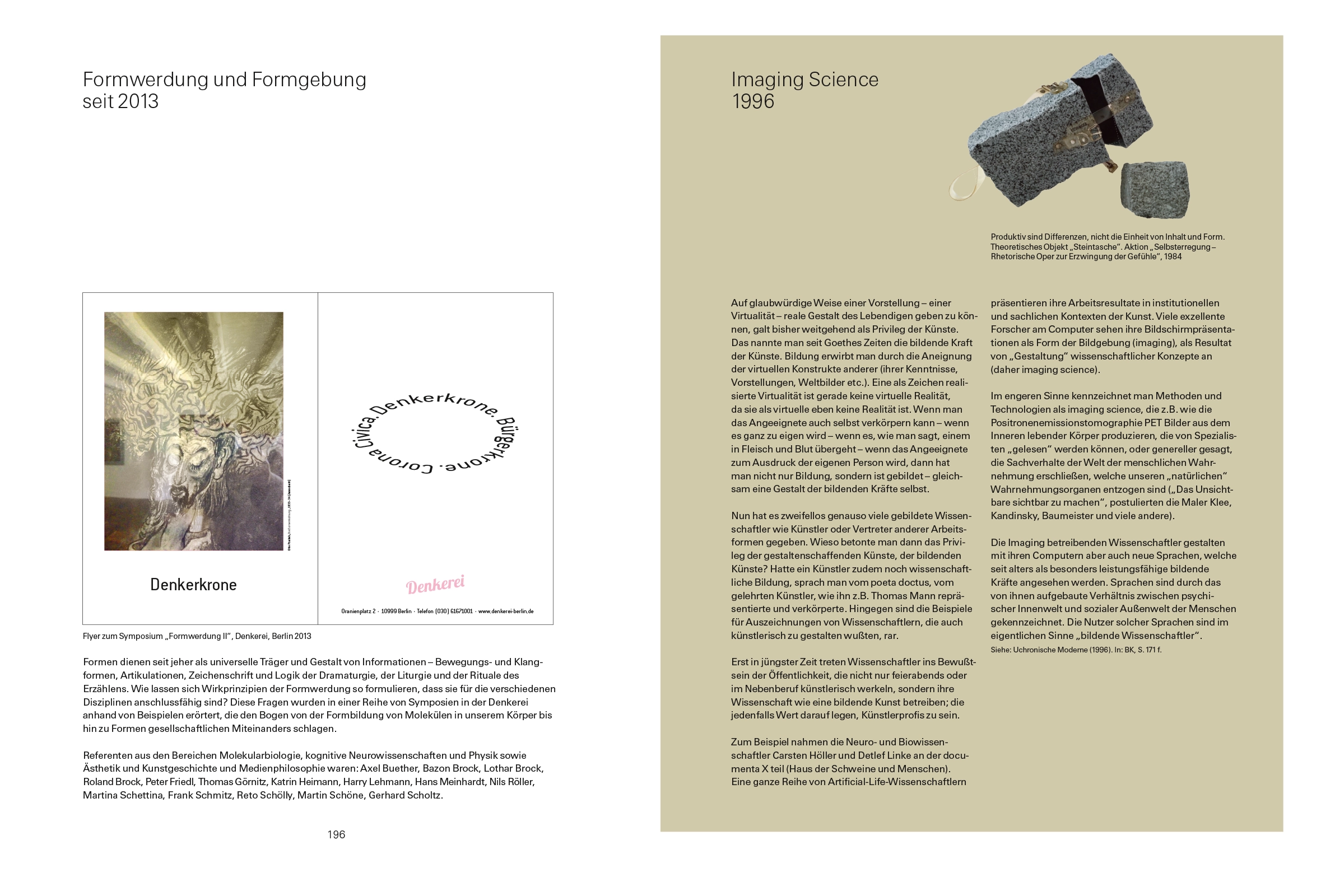 Zum Beispiel nahmen die Neuro­ und Biowissenschaftler Carsten Höller und Detlef Linke an der documenta X teil (Haus der Schweine und Menschen). Eine ganze Reihe von Artificial­-Life­-Wissenschaftlern präsentieren ihre Arbeitsresultate in institutionellen und sachlichen Kontexten der Kunst. Viele exzellente Forscher am Computer sehen ihre Bildschirmpräsentationen als Form der Bildgebung (imaging), als Resultat von „Gestaltung“ wissenschaftlicher Konzepte an (daher imaging science).