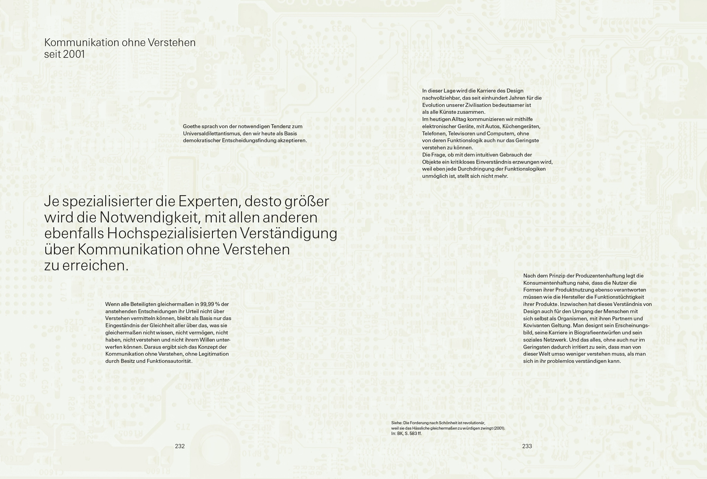 In dieser Lage wird die Karriere des Design nach vollziehbar, das seit einhundert Jahren für die Evolution unserer Zivilisation bedeutsamer ist als alle Künste zusammen. Im heutigen Alltag kommunizieren wir mithilfe elektronischer Geräte, mit Autos, Küchengeräten, Telefonen, Televisoren und Computern, ohne von deren Funktionslogik auch nur das Geringste verstehen zu können. Die Frage, ob mit dem intuitiven Gebrauch der Objekte ein kritikloses Einverständnis erzwungen wird, weil eben jede Durchdringung der Funktionslogiken unmöglich ist, stellt sich nicht mehr.