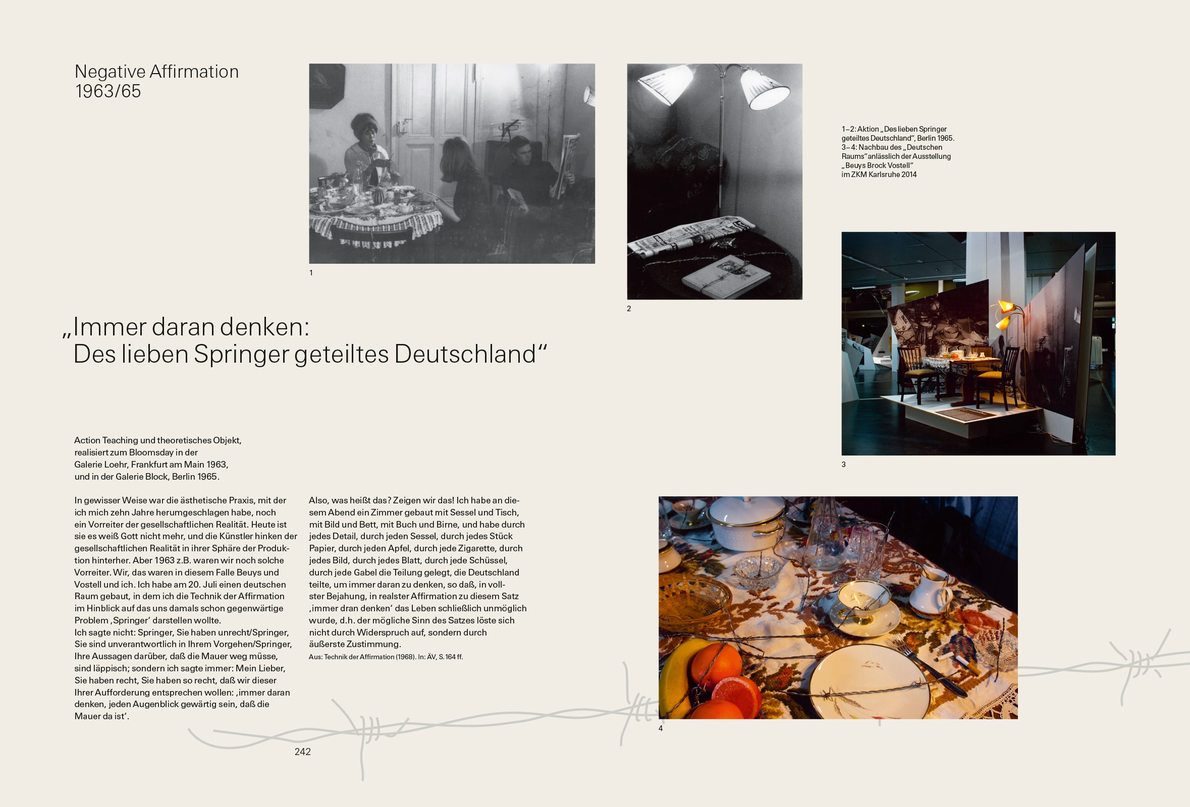 In gewisser Weise war die ästhetische Praxis, mit der ich mich zehn Jahre herumgeschlagen habe, noch ein Vorreiter der gesellschaftlichen Realität. Heute ist sie es weiß Gott nicht mehr, und die Künstler hinken der gesellschaftlichen Realität in ihrer Sphäre der Produktion hinterher. Aber 1963 z.B. waren wir noch solche Vorreiter. Wir, das waren in diesem Falle Beuys und Vostell und ich. Ich habe am 20. Juli einen deutschen Raum gebaut, in dem ich die Technik der Affirmation im Hinblick auf das uns damals schon gegenwärtige