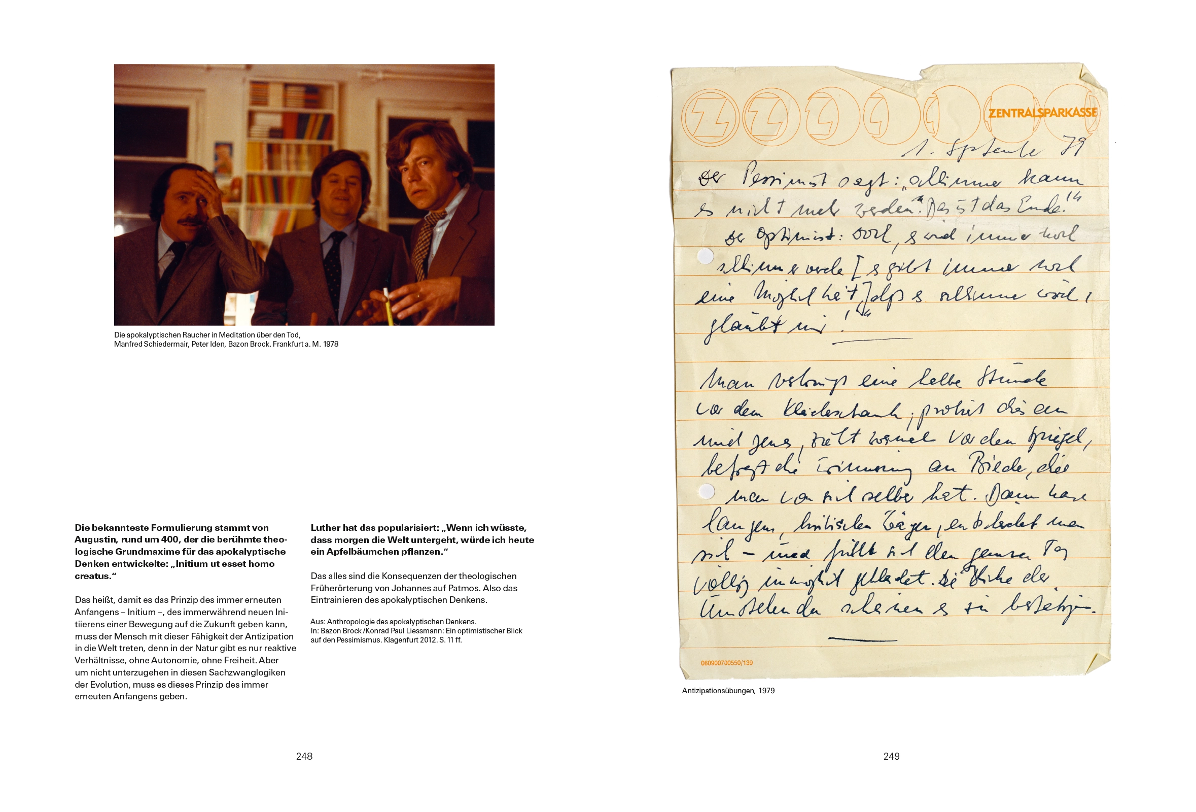 Bazon Brock, Jahrgang 1936, ab 9. März 1945 Flüchtling aus Hinterpommern und Kriegskind in den Hauptkampflinien Zoppot, Neufahrwasser, Gotenhafen und Hela; belehrt durch die Feigheit ordenssgeschmückter Offiziersgockel und den Mut von Frauen und Müttern; modernitätstauglich geworden in Lagern, die nachweislich kein Kind unter 4 Jahren überlebt hat; ab 1949 endlich in der Obhut tüchtiger Gymnasiallehrer in Itzehoe/Holstein; ergriffen mit Dichterkollegen im Seminar über das 2. Buch „Parzival“ des Wolfram von Eschenbach; intellektualisiert durch kabarettistische Vernunft zwischen Carlo Schmid und Carl Schmitt und Ludwig Erhard und Heinz Erhardt; poetisiert von Claus Brehmer und Daniel Spoerri in der Dramaturgie des Staatstheaters Darmstadt; begriffslyrisch gestimmt durch Heidegger und Adorno; publizierte im Herbst 1957 sein erstes Buch „Kotflügel Kotflügel“; realisierte eine zentrale Rolle aus Goethes „Wilhelm Meister“, indem er Erster Dramaturg unter Gnekow im Stadttheater Luzern wurde (im Pagendienst für Therese Giehse und Käthe Gold); schließlich ab Oktober 1965 Lehrer für nichtnormative Ästhetik neben den Kollegen Max Bill und Max Bense an der Hamburger Hochschule für bildende Künste …