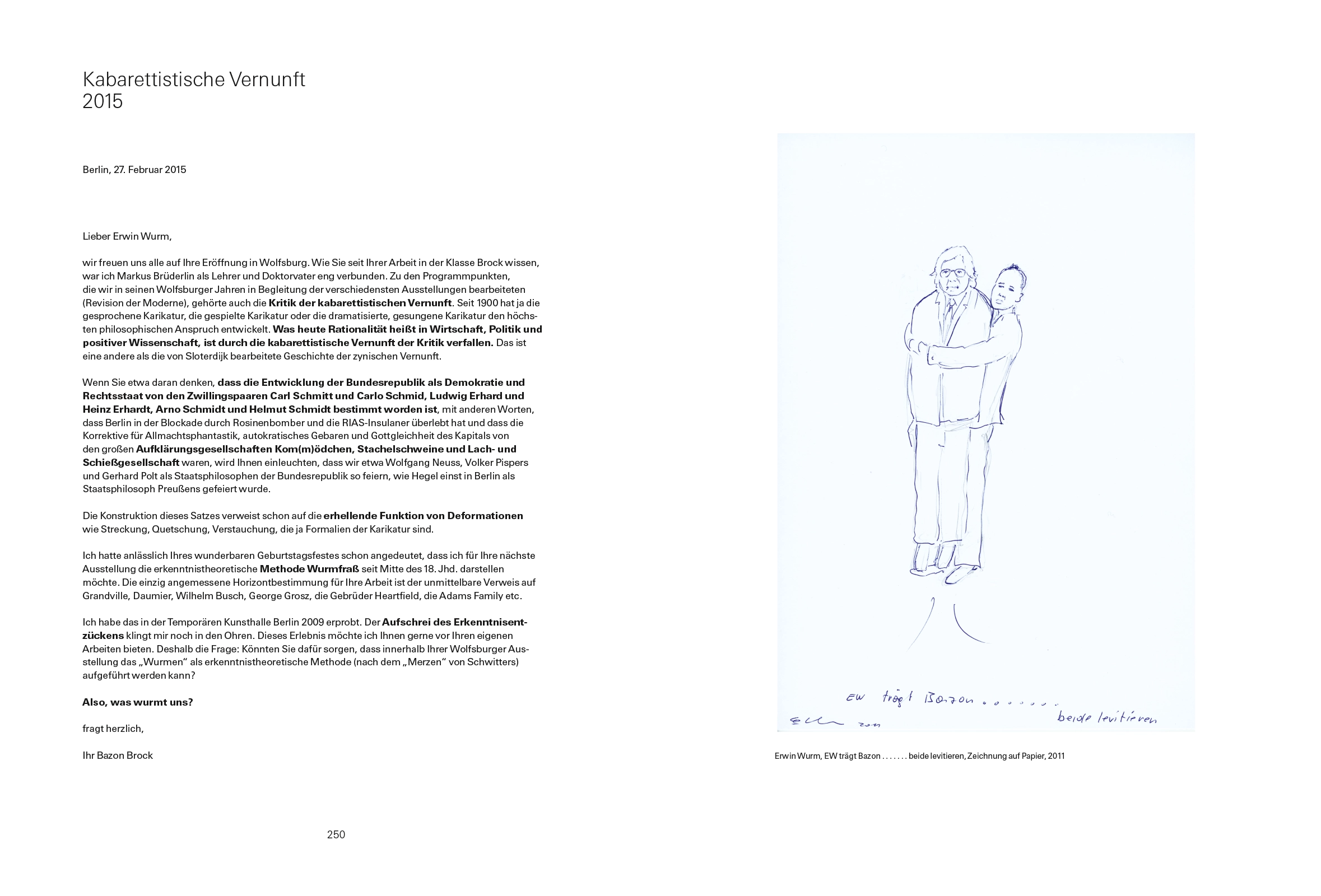 wir freuen uns alle auf Ihre Eröffnung in Wolfsburg. Wie Sie seit Ihrer Arbeit in der Klasse Brock wissen, war ich Markus Brüderlin als Lehrer und Doktorvater eng verbunden. Zu den Programmpunkten, die wir in seinen Wolfsburger Jahren in Begleitung der verschiedensten Ausstellungen bearbeiteten (Revision der Moderne), gehörte auch die Kritik der kabarettistischen Vernunft. Seit 1900 hat ja die gesprochene Karikatur, die gespielte Karikatur oder die dramatisierte, gesungene Karikatur den höchsten philosophischen Anspruch entwickelt. Was heute Rationalität heißt in Wirtschaft, Politik und positiver Wissenschaft, ist durch die kabarettistische Vernunft der Kritik verfallen. Das ist eine andere als die von Sloterdijk bearbeitete Geschichte der zynischen Vernunft.