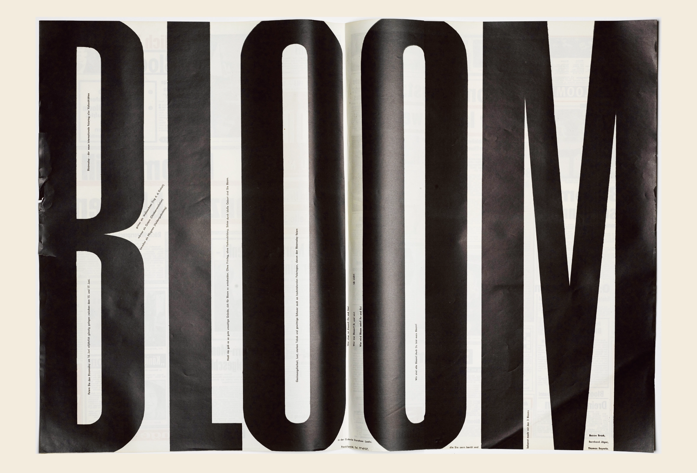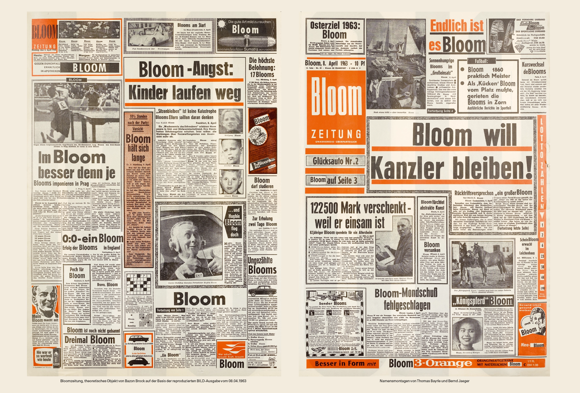 Einen Maßstab für die rumorologische Vergegenwärtigung des Vergangenen, das es nie gegeben hat, und für die Kritik an der Zukunft, die es nie geben würde, setzten wir mit der Einführung der Feier des Bloomsday in der Galerie Loehr an jedem 16. Juni, jenem fiktiven Datum, an welchem James Joyce seinen Ulysses Leopold Bloom durch den Weltentag wandern läßt. Die in Action Teachings, Happenings, rhetorischen Kaskaden und weihevollen Pastoralen verbreiteten Gerüchte bildeten ein Geflecht von Erzählungen, wie es der Roman von Joyce ist: eine Biographie der Anonymität des Jedermann, dem ich mit Hilfe von Thomas Bayrle und Bernd Jaeger die Tagesausgabe der Bildzeitung vom 8. April 1963 widmete, indem wir jeden Eigennamen durch Leopold Bloom ersetzten. Darf ich behaupten, den Beweis für die Effektivität der Rumorologie mit der Etablierung des Bloomsday erbracht zu haben, weil seither alljährlich tausende Zeitgenossen der Ver­gangenheit in Deutschland diesen Tag feiern? Die bei diesem Anlaß erfundenen Geschichten und deren gerüchteweise Verbreitung übertreffen inzwischen den Joyceschen Roman und die Bestände aller Archive, in denen die Ereignisse des 16. Juni 1904 dokumentiert sind.
