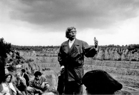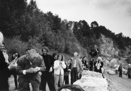 „Gemeinsam mit einigen Kollegen aus dem wissenschaftlichen Bereich, darunter Dietmar Kamper, Beat Wyss und Friedrich Kittler, bearbeitete ich 1991 in dem action teaching „Wir geben das Leben dem Kosmos zurück“ das Vorstellungsfeld einer Theorie der irdischen Lebensentstehung. In einer Wuppertaler Kiesgrube, in der auch der Neandertaler gefunden wurde, trafen zahllose Studenten ein, und gemeinsam schleuderten wir das Leben zurück ins All. Auf dem Film zu der Aktion sieht man deutlich das Streben der Künstler dokumentiert, sich erinnerbar werden zu lassen mit ihrem Werk. Die beschleunigten Prozesse sind zu sehen, wie auch berühmte Denkbewegungen versinnbildlicht sind. Denn mit dem Wurf des mit Lebensspuren imprägnierten Stein, ist nicht nur ein Bezug zur so genannten Lebensspurtheorie hergestellt, nach der aus dem Weltraum kleine Meteoriten bei uns einschlugen, die imprägniert waren mit Lebensspuren, sondern zugleich bezieht man sich auf Adorno, der bereits über die Fallkurve eines geworfenen Steines Denkbewegungen auslöste.“