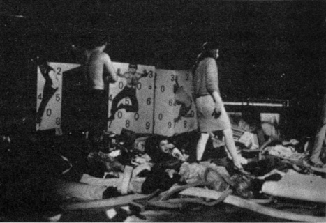 Verwandlung des Lebens in Reste, Unverwertbares, Spuren des Gewesenen. Immer erneuertes Angebot von Waren als Material, das durch seinen Verschleiß gebändigt werden muß. Jetzt beteiligen sich auch Zuschauer an der Umsetzung des Warenangebots. Deutliche Analogien zu anderen schon geschichtlichen Vernichtungsaktionen. Die Protagonistin läßt sich vom Professor überreden mitzumachen, um sich von dem Emotionsstau ihres gegenwärtigen stagnierten Lebens zu entlasten. Das gelingt ihr offensichtlich nicht. Deshalb versucht sie, sich vor dem übermächtigen Kaufhauswarenangebot auf Erinnerungswerte zurückzuziehen, die an alten Fotos, Kleidungsstücken, Landschaften, Fahrkarten usw. hängen. Diese Gegenstände sind im Spielfeld aufgebaut. Die Protagonistin spielt eine Geschichte, aus deren Zusammenhang möglicherweise die einzelnen verbrauchten Gegenstände (Erinnerungen) stammen. Sie will die vereinzelten Gegenstände mit ihrem Leben identifizieren, um dessen sinnfälligen Verlauf und Zusammenhang zu demonstrieren. Sie spielt und stellt einzelne Stationen dieses Lebens nach, kann ihnen aber in den Augen des Publikums keinerlei Evidenz abgewinnen. Sie wird ständig von den Umstehenden zur Korrektur gezwungen bzw. ausgelacht. Sie selbst wird den Zuschauern zum Objekt wie eine Ware, die man zerlegt an der gegenüberliegenden Wand in einzelnen 'Schaufenstern' nacheinander ausstellt: eine vereinzelte Hand, eine Kniekehle usw. Ihr Leben wird wie eine Ware beliebig vervielfältigbar: die Zuschauer kaufen Teile ihres Lebens und spielen mit ihr nach ihren Wünschen und Vorstellungen die einzelnen erinnerten Begebenheiten durch. Die angenehmsten Lebensabschnitte (nächtliche Autofahrt zu zweit, mit vollem Scheinwerferlicht durch das dunkle Spielfeld, wobei die Lichtkegel immer wieder im Spielfeld einzelne Begebenheiten erfassen, die sich nächtens an und auf Straßen abspielen) werden von mehreren Zuschauern gekauft und deshalb mehrmals mit immer anderen Zuschauern wiederholt. Die Lebensverbraucher bauen nach dem Muster der Lebensabschnitte der Protagonistin nun mit Frauen, Freunden oder Zufallsbekanntschaften ihr schon gelebtes Leben noch einmal, jedoch mit anderen Resultaten nach.