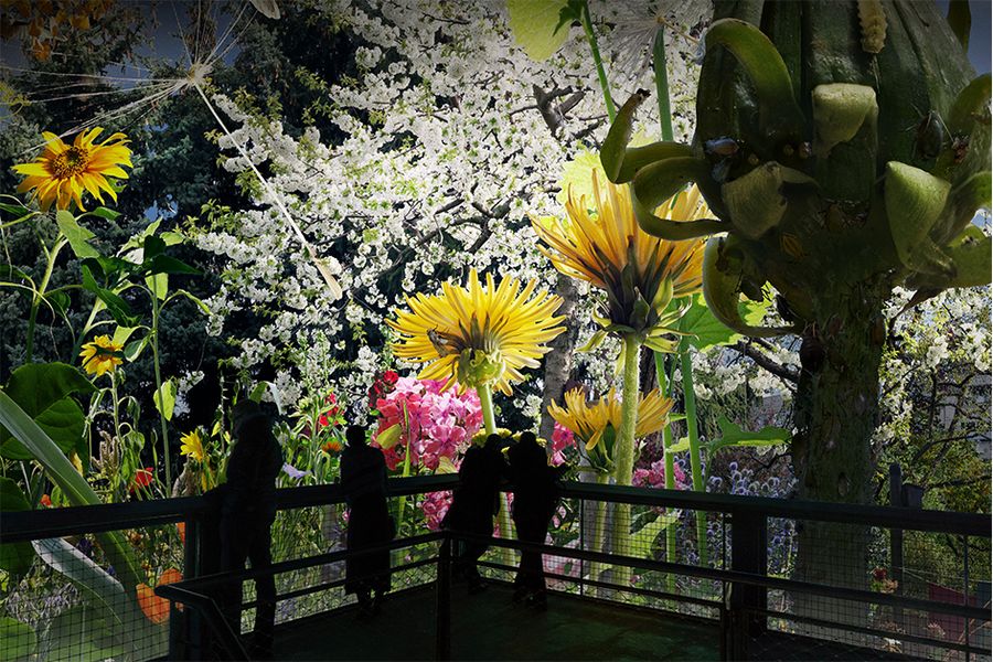 Yadegar Asisi überträgt Dürers Verfahren der Nahansicht eines kleinen Stückchens Rasen auf alle Lebensformen in einem Garten. Das gab es bisher nur in der Literatur, z.B. als Erzählung über die fantastischen Reisen Gullivers oder des Däumlings, und in filmischen special effects. Asisi legt uns nahe, den Gedanken der Mitgeschöpflichkeit auch auf unsere Beziehung zu den sonst kaum sichtbaren Formen des Lebens zu erweitern. So erschließt uns der Künstler als Archäologe der Kulturen auch historisch weit zurückliegende Weltsichten wie die der europäischen Mystiker oder des indischen Hinduismus.