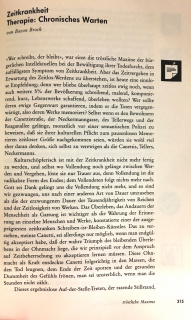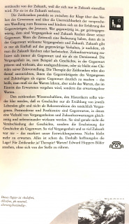 Die Zeitkranken pendeln so zwischen der Klage über den Verlust des Gewesenen und über die Unerreichbarkeit der versprochenen Wandlung zum Besseren und hindern sich an der Erfahrung des Gegenwärtigen, der Jetztzeit. Wer gegenwärtig ist, gar geistesgegenwärtig, dem sind Vergangenheit und Zukunft Realien dieser seiner Gegenwart. Wenn die Zeitmodi eine Bedeutung haben, dann als in der Gegenwart wirksame Vergangenheit und Zukunft. Zukunft gibt es nur als Einfluß auf das gegenwärtige Verhalten, je nachdem, ob man die Zukunft fürchtet oder herbeisehnt. Zukunftserwartung realisiert sich immer als Gegenwart und nie als ein Dereinstmal. Die Vergangenheit ist, zum Beispiel als Geschichte, in der Gegenwart präsent und wirksam, also unabgeschlossen, oder sie bleibt eine Chimäre naiver Zeitvorstellung. Die Therapie der Zeitkranken wäre also darauf auszurichten, ihnen das Gegenwärtigsein des Vergangenen und Zukünftigen als eigene Gegenwart deutlich zu machen – das heißt, man muß sie das Warten lehren, aber nicht das Warten, das im Eintritt des Erwarteten vergehen wird, sondern das erwartungslose Warten.