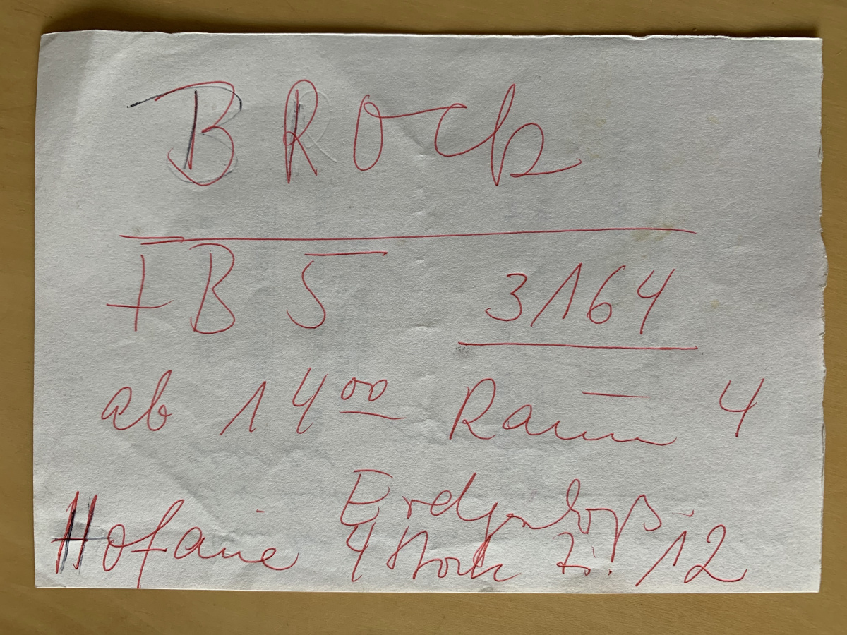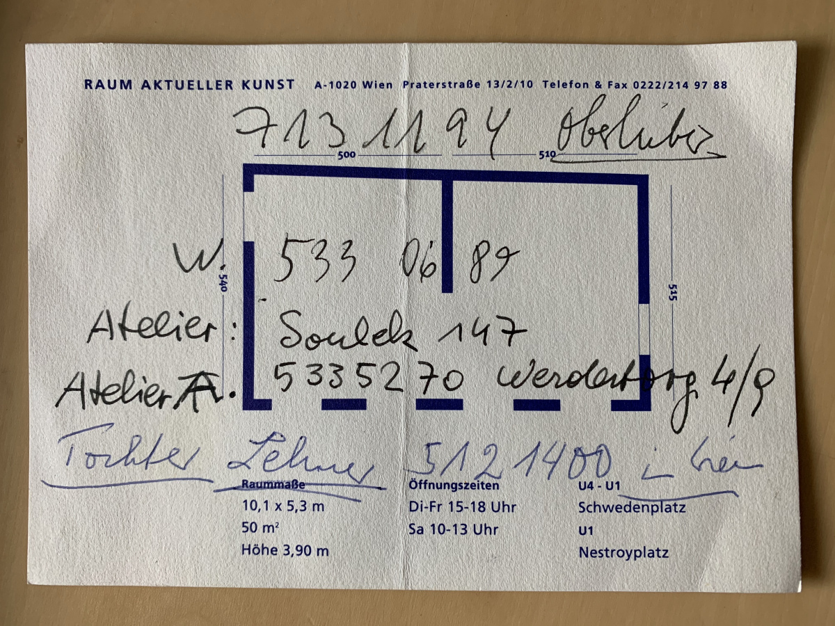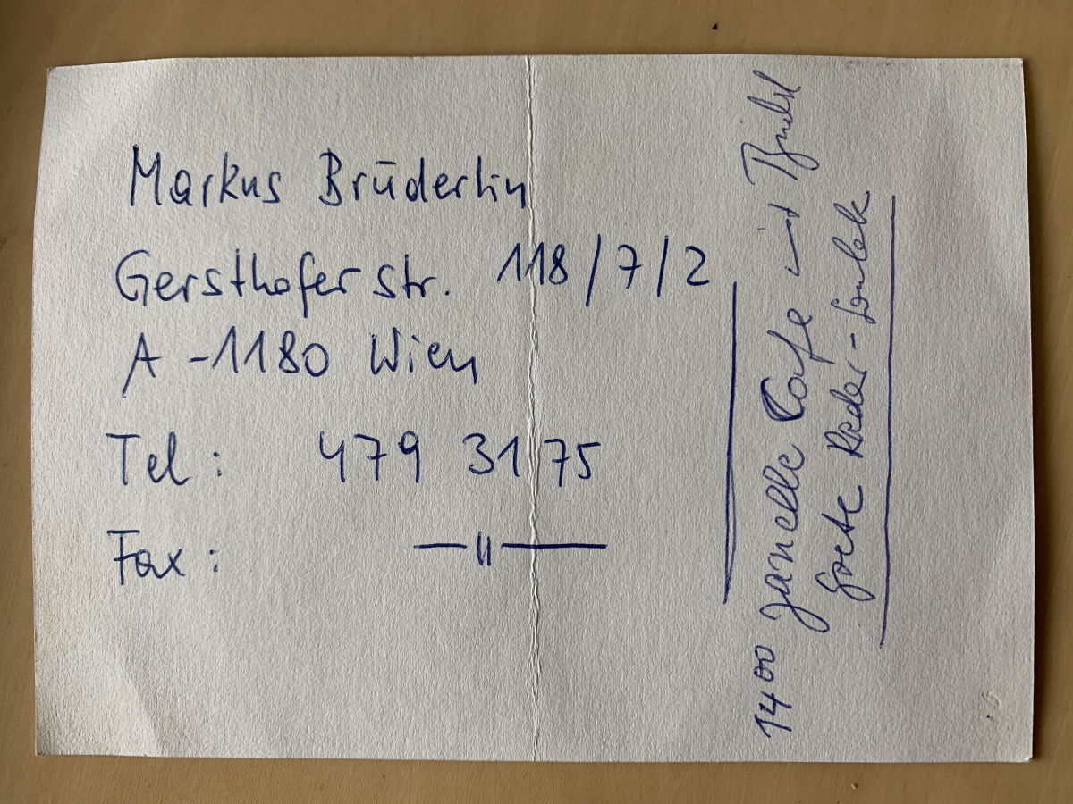 Brüderlins Adresse zu der Zeit, als er Ende der 1970er Jahre in Wien bei Bazon Brock studierte. 15 Jahre später promovierte er bei Brock in Wuppertal mit einer der wichtigsten ästhetisch-kunstgeschichtlichen Arbeiten des 20. Jahrunderts: „Die Einheit in der Differenz: die Bedeutung des Ornaments für die abstrakte Kunst des 20. Jahrhunderts“, Diss. Wuppertal 1995.