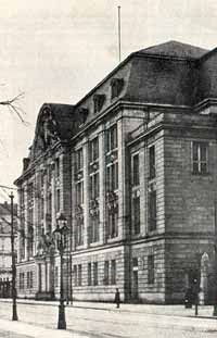 Der Bau des dritten Gebäudekomplexes Prinz-Albrecht-Straße 8 erfolgte von 1901 bis 1905. Hier zog die Staatliche Kunstbibliothek und die Lipperheide-Kostümbuchsammlung ein (zeitweilig 96000 Besucher jährlich). Kurt Glaser, ein Jude, leitete die Bibliothek in den 20er Jahren. Bruno Paul (1874-1968), Leiter der Unterrichtsanstalt, war unter anderem Zeichner für die Zeitschrift "Der Simplicissimus". Er schied 1933 aus dem Dienst aus [M1]. Nach 1933 wird der Bau von der Gestapo übernommen [M2]. Die Bestände der Kunstbibliothek werden wieder ins Kunstgewerbemuseum (Gropius-Bau) verfrachtet, und die Bildhauerwerkstätten des Kellergeschosses werden zu Gefängniszellen umgebaut. Das umfangreiche Karteisystem der Bibliothek wird durch das Fahndungsarchiv der Gestapo ausgetauscht. Später wird der Südflügel in Richtung Prinz-Albrecht-Hotel erweitert. Auf diesem Grundstück war im 19. Jahrhundert einmal ein Römerbad etabliert. In dem Hotel stieg 1929 Virginia Woolf ab. Bevor 1934 die Reichsführung SS von München hierher verlegt wurde, sprachen Hitler und Goebbels im Hotelsaal zu ihren Anhängern [M3].