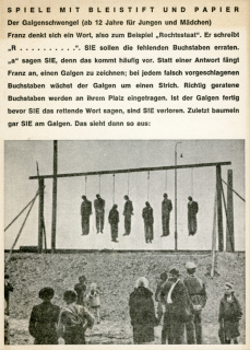 Galgenhumor. Spiele mit Bleistift und Papier, Bild: Postkarte, Montage aus Text und Bild, für die Aktion „Wollt ihr das totale Leben?“, 1962. Text aus: Johanna Preetorius, Knaurs Spielbuch, Droemer, München, 1953, Foto aus: Tadeusz Mazur, Jerzy Tomaszewski, Stanislaw Wrzos-Glinka (Hg.), We Have not Forgotten. 1939–1945, Warschau, 1959..