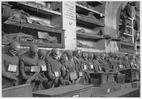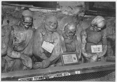 Die erwartete Zukunft wird offensichtlich als eine Ewigkeit des Gegenwärtigen verstanden. Denn selbst die Gesellschaft der Toten kennt noch scharfe Trennung der Berufe und Stände. Immerhin wird hier die Anstrengung, das Leben des Einzelnen auf Dauer zu stellen, nicht mehr nur dem Herrscher zuteil, sondern jedem Fleisch von seinem Fleisch., Bild: Palermo 1972 © Melusine Huss.