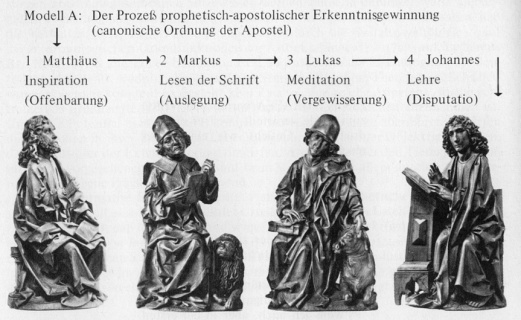 Der Prozeß der apostolisch-kanonischen Erkenntnisgewinnung verläuft über folgende Ordnung der Erkenntnisschritte, die zugleich einen möglichen Zusammenhang der Vierergruppe darstellt, obgleich diese Zuordnung mit der künstlerischen Gestaltlogik nicht in Übereinstimmung zu bringen ist. Die Erkenntnis umfaßt dieser Zuordnung gemäß immer zugleich Offenbarungswissen, Traditionswissen, Selbstwissen und Lehrwissen.
