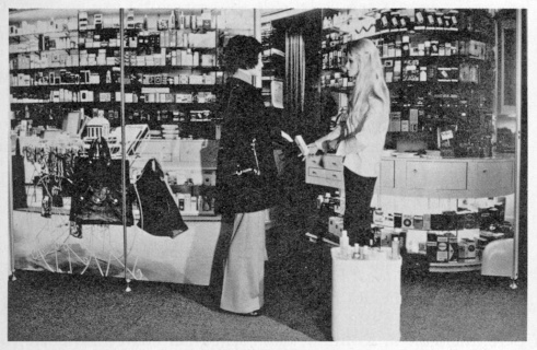 Funktion des Bildes: Es sind folgende Gesichtspunkte zu beachten: Enger Raum ohne sichtbare Sitzgelegenheit - der Käufer soll den Eindruck ständiger Bereitschaft von seiten des Personals erhalten. Die Verkäuflichkeit der Ware steigt mit dem Gefühl des Kunden, alles warte nur auf ihn, sei gleichsam begierig, sich mit ihm zu beschäftigen und ihn zu bedienen.