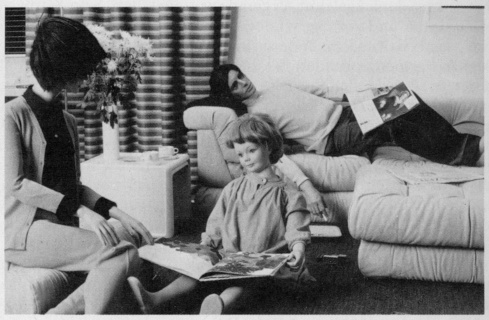 Was der Vergleich der Sitzhaltungen zeigt, wird vielleicht deutlicher, wenn hier ein und dieselbe Person einmal auf einem Cornelius-Stuhl und einmal in einem Ackermann-Sessel zu sehen ist. Auf dem Cornelius-Stuhl drückt die Haltung des Sitzenden ein aktives Verhältnis zu den Vorgängen im Raum aus. Der Sesselsitzer hingegen scheint passiv in sich versunken, zurückgelehnt, ja geradezu eingefallen. Sein Körperschwerpunkt ist weit nach unten und vorn verschoben, so daß es ihm besondere Anstrengung machen würde, seine Haltung zu ändern, indem er etwa aufsteht oder in aktiver Bewegung sich einem Partner zuwendet.