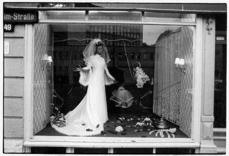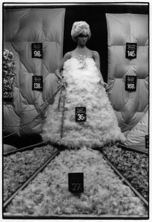 Auch die ausgestellten Hochzeitskleider, Bilder (I) und (J), sind von ihrem Verwendungszweck her hochgradig bestimmt. Das Brautkleid kann nur zur Hochzeit getragen werden. Die Einmaligkeit seines Verwendungszweckes macht es notwendig, den Gegenstand selber zu etwas Kostbarem zu stilisieren, in der Auswahl des Materials, der Farbe und des Schnitts. Der Schnitt des Gewandes, seine Materialfülle steht bis auf den heutigen Tag in der Tradition der Ritualgewande. Die Materialität des Hochzeitskleides zwingt seiner Trägerin Verhaltensweisen auf, die dem Ritual angemessen sind: Würde in der Langsamkeit des Schreitens, eine gewisse Bewegungsstarre, die entpersönlicht und damit die bloße Beliebigkeit jeweils persönlicher Ausfüllung des Rituals verhindert. Nicht nur die Furcht, das Kleid zu beschmutzen oder zu beschädigen, veranlaßt die Trägerin, ihre mögliche spontane Reaktion zu unterdrücken. Entscheidend ist, daß durch das Tragen des Ritualkleides die Trägerin die dem Ritual angemessene Verhaltensweise wenigstens formal erfüllen kann, wo diese Verhaltensweisen nicht mehr erlernt und inhaltlich nicht erfaßt werden. Solche Ritualkleidung ist außerhalb der rituellen Handlung nicht tragbar, da sie den dafür notwendigen Verhaltensweisen und Entäußerungsweisen im Wege steht. Es sei denn, der gesamte Lebensbereich wäre hochgradig ritualisiert wie in der alltäglichen Verhaltensritualisierung bei Richtern, beim Klerus. Dem entspricht, daß etwa Herrschaftsrollen durch die Jahrhunderte hin mit der Ritualisierung des Verhaltens einhergingen, wodurch die Repräsentation der Herrschaft von den Momenten bloßer personaler Herrschaftsansprüche befreit wurde. Das Ritualgewand wird zur Arbeitskleidung der Herrschaft Ausübenden. Ritualgewande sind wenigstens knöchellang, zumeist schleppenförmig ausgeweitet, schwer und verweigern die Anpassung an die individuellen Körperformen. Das hier abgebildete Schaufenster (I) zeigt demzufolge ganz richtig, daß selbst der zu einer Hochzeit notwendige männliche Partner nur eine formale Position des Rituals erfüllt. Selbst er wird zur Staffage wie Schleppenträger, Trauzeugen, Blumenkinder, Brautjungfern. Die Schaufensterbetrachterin als potentielle Braut braucht sich selbst nur in die durch das Ritual eindeutig vorgegebenen Handlungsabläufe einzugliedern, indem sie sich selbst zur Trägerin des Hochzeitskleides macht.