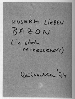 Begleitheft, S. 3, Bild: UNSERM LIEBEN BAZON (in statu re-nascendi) Weihnachten '74.
